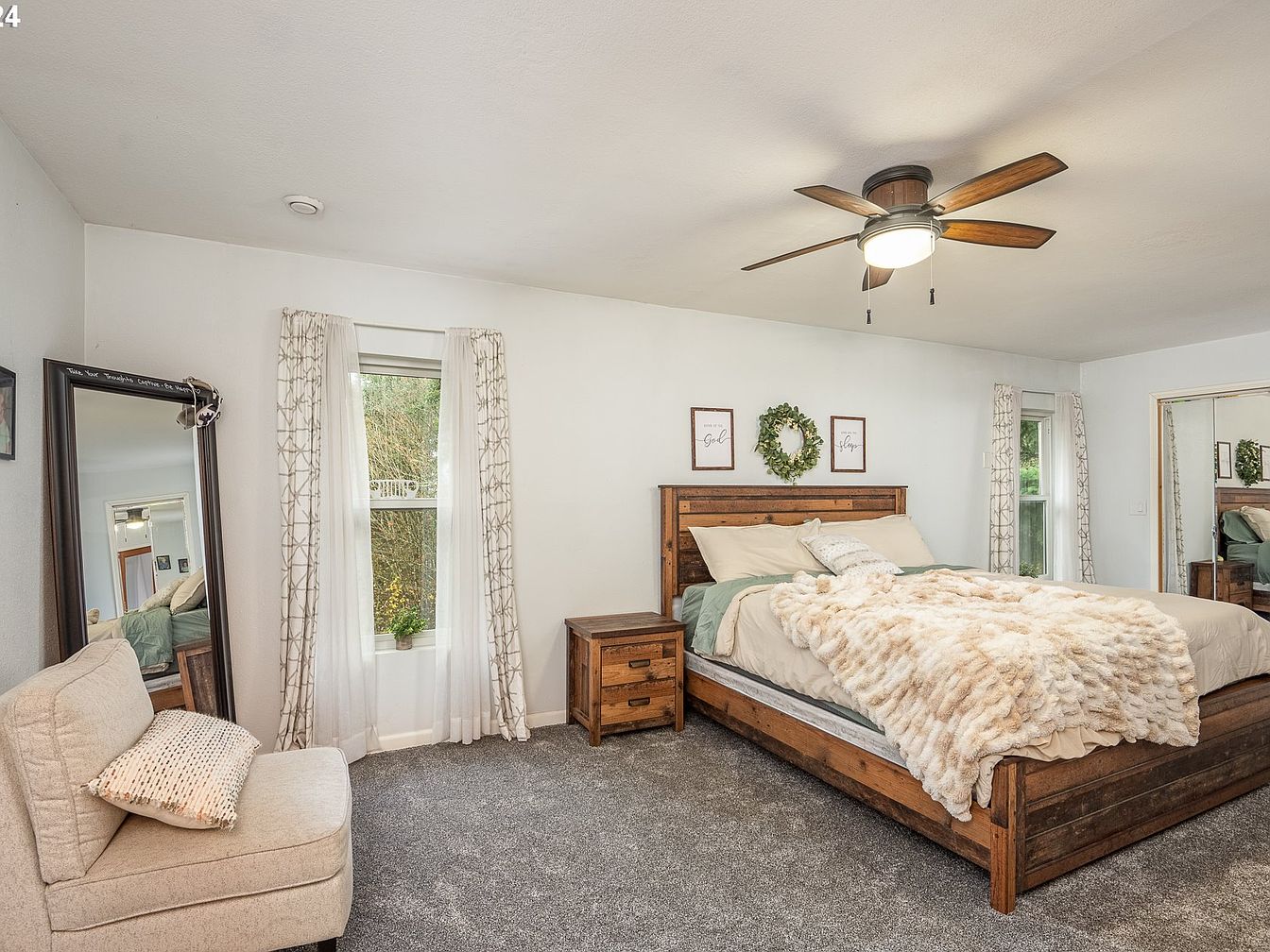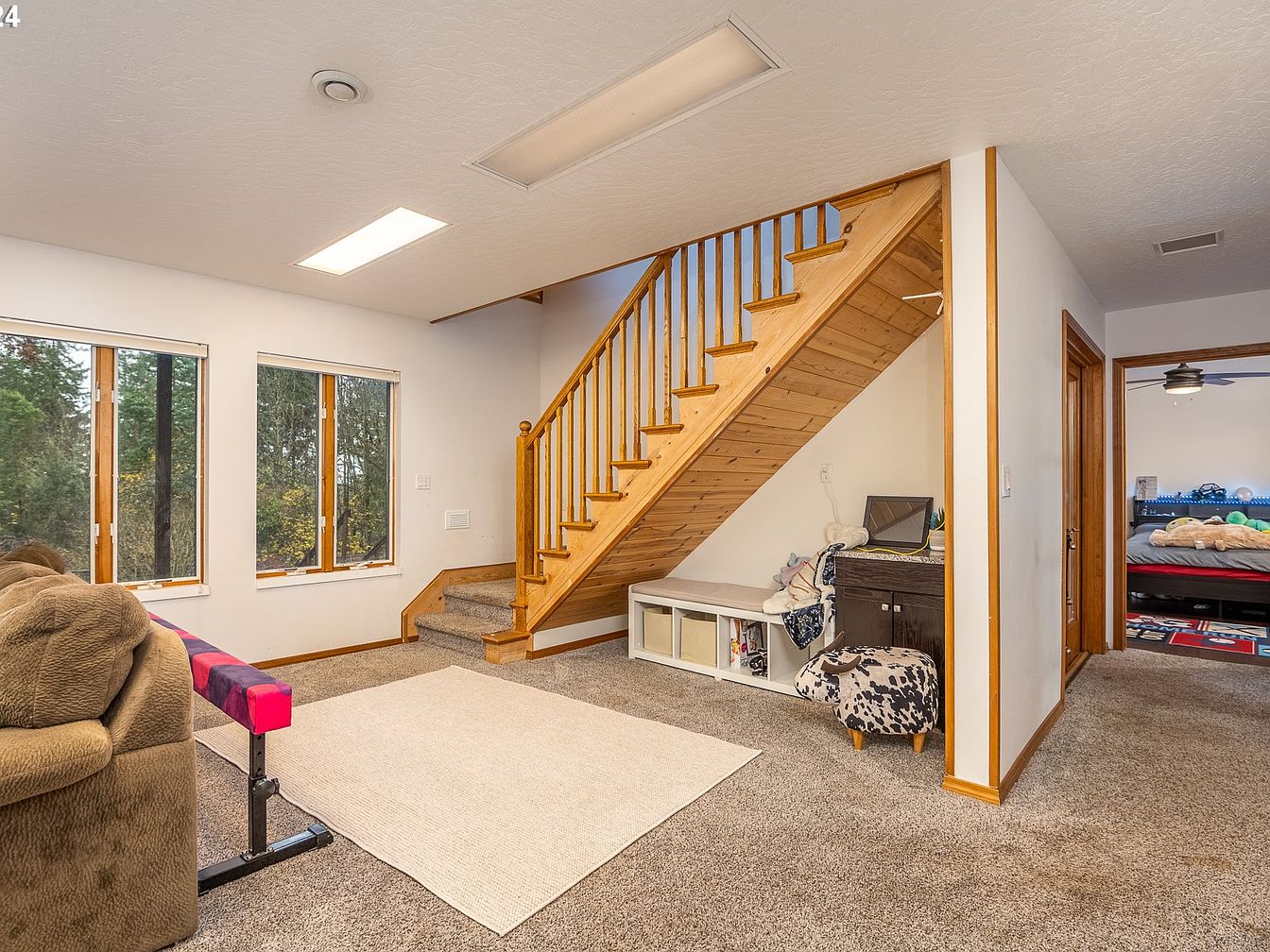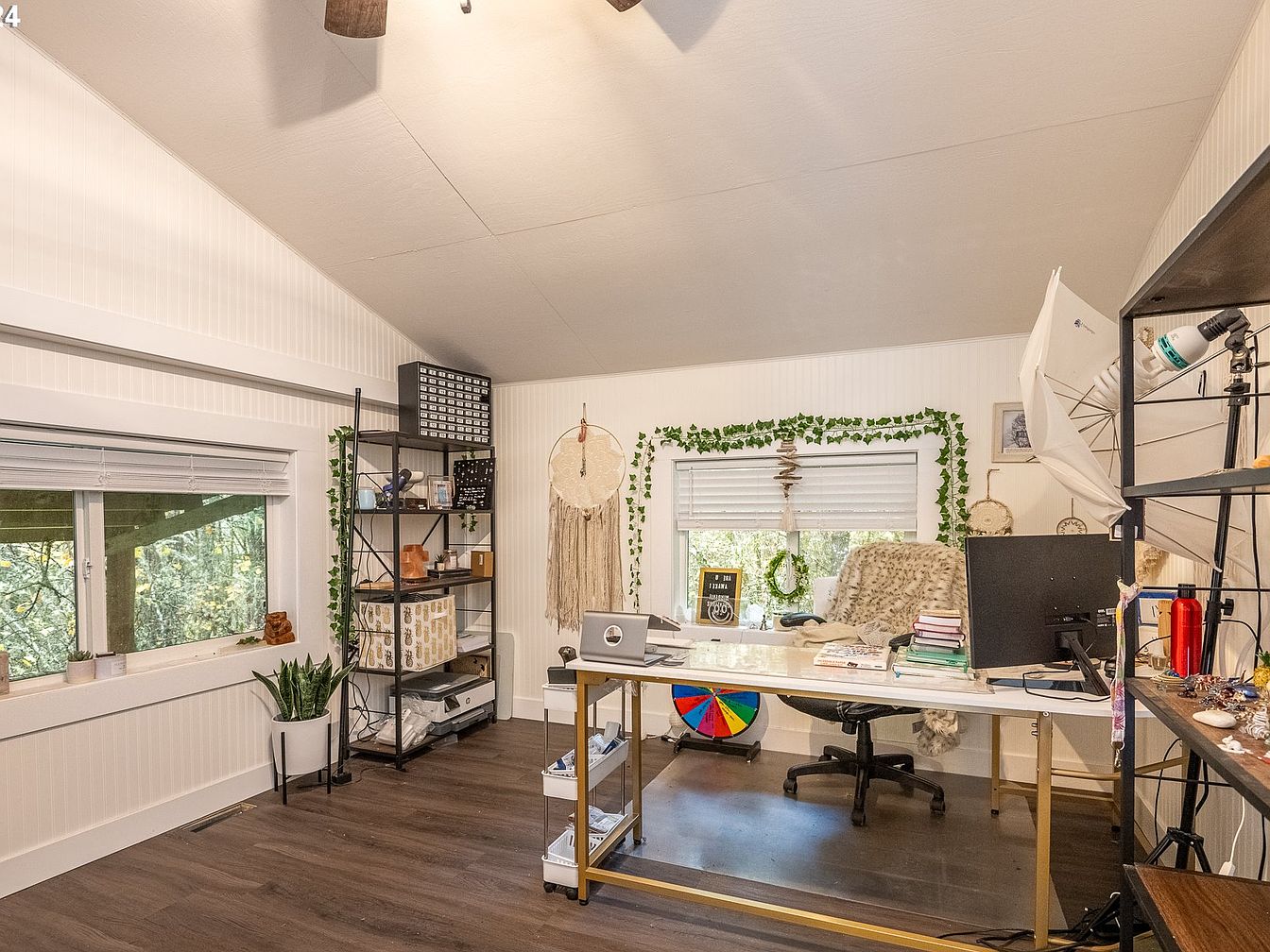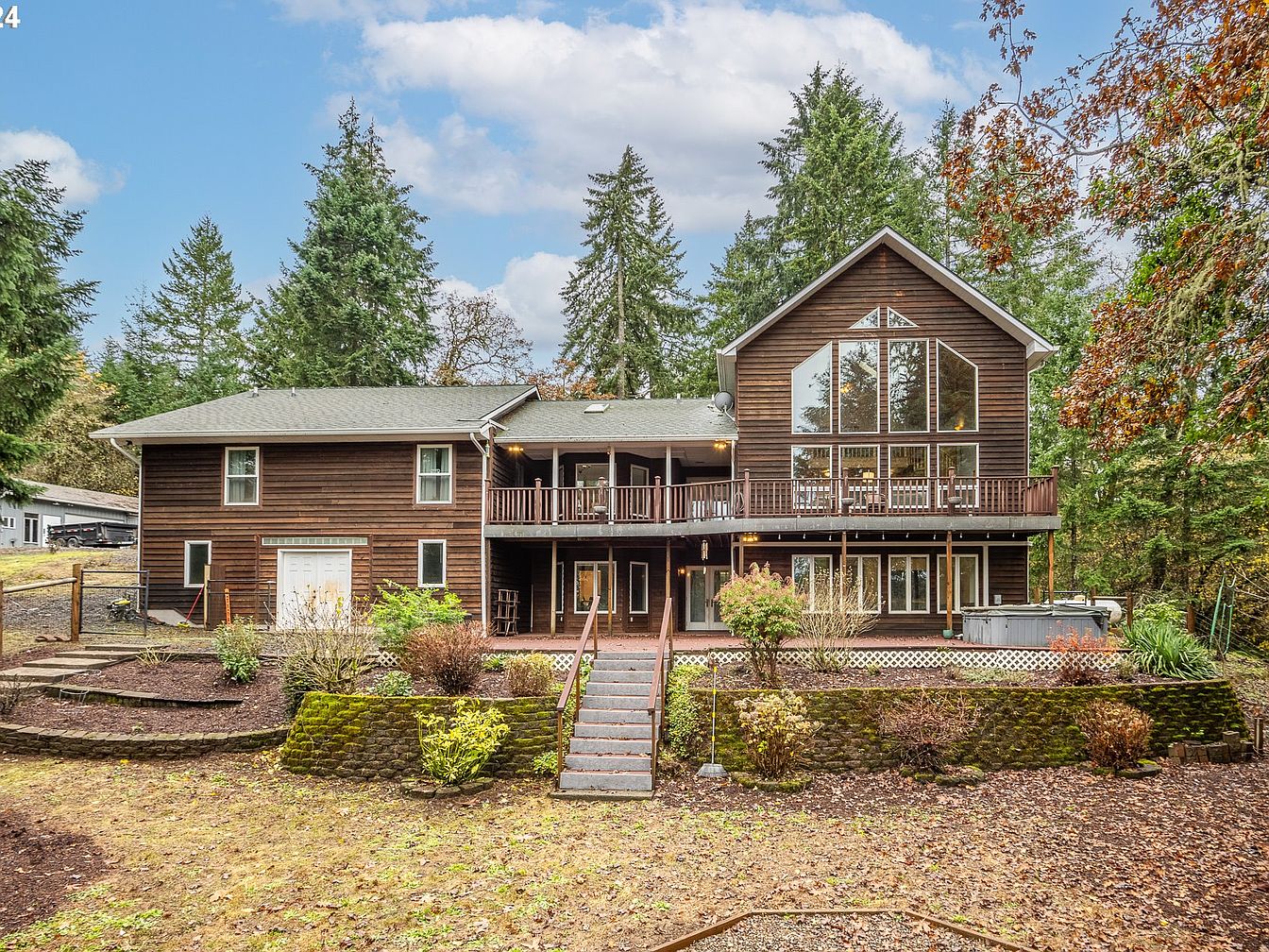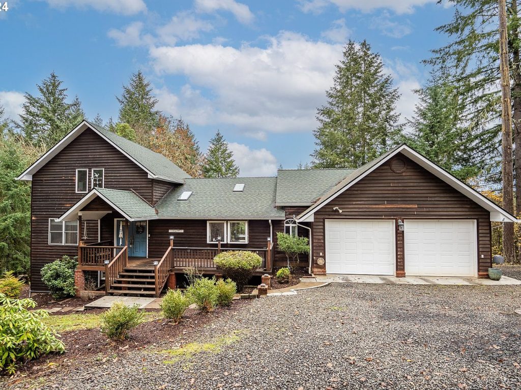 This charming custom-built home is a blend of rustic and modern architectural styles, nestled on a spacious 5-acre plot in the serene Willamette Valley, near Junction City, Oregon. Designed for both relaxation and entertainment, the home offers a warm and inviting atmosphere with its dark wood siding and green roof, complementing the natural surroundings. Built with careful attention to detail, it features vaulted ceilings allowing abundant natural light, a chef’s kitchen equipped with a high-end 6-burner Wolf range, granite countertops, and an eat-in bar perfect for gatherings. The residence includes a primary bedroom on the main level and two additional ensuite bedrooms on the lower level, ensuring privacy and comfort for family and guests. Recent improvements include a newer composite roof and radiant floor heating for enhanced comfort throughout the home. Outdoor living spaces are ample, with an upper deck, a lower patio, and a welcoming front porch that overlooks the beautiful landscape. Additional amenities include a large 1000 sq. ft. versatile shop with ductless heating, a tool shed, Generac generator for power security, and convenient RV parking. Priced at $795,000, this unique property offers the best of Oregon’s tranquil countryside living with functional luxury and ample storage space.