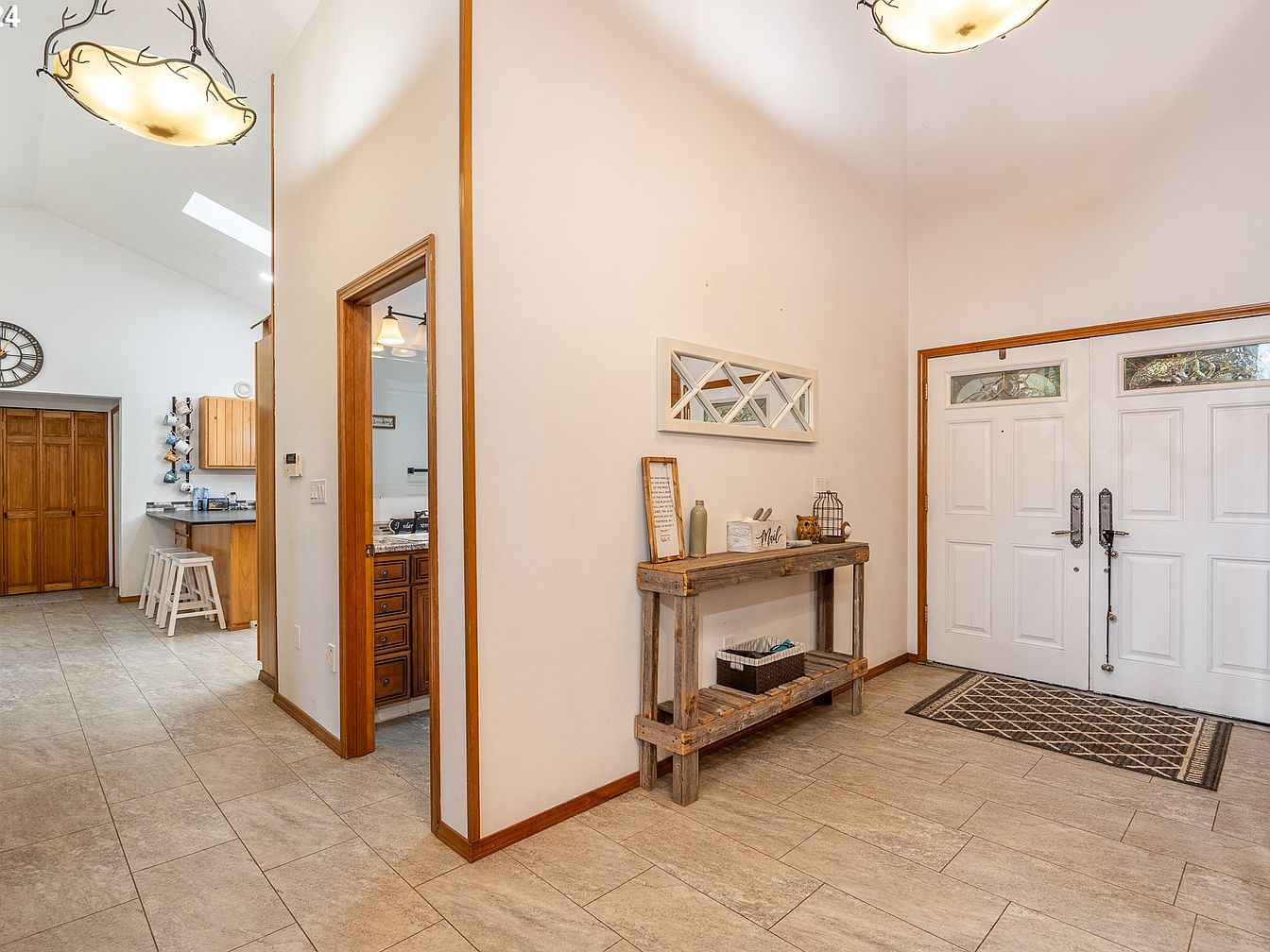 The entryway leads into a spacious hallway with high vaulted ceilings that create an airy, open feel. The floor features large, beige-toned tiles that extend throughout the visible space, complementing the natural wood trim around doorways and baseboards. A rustic wooden console table against the white wall adds warmth and farmhouse charm with decorative items and a rectangular mirror above it. Double white doors with glass inserts let in natural light. Off the hallway, a kitchen area with light wood cabinetry and a small breakfast bar with stools is visible, highlighting a casual and welcoming atmosphere.