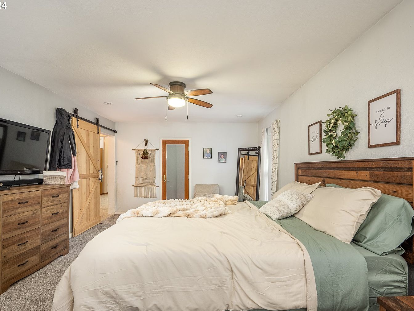 This cozy master bedroom combines rustic charm with modern comfort. A large wooden headboard anchors the space, complemented by soft green bedding layered with beige linens and plush pillows, creating a soothing color palette. Above the bed, framed inspirational quotes and a decorative green wreath add subtle personality. Opposite the bed sits a wooden dresser topped with a flat-screen TV and a practical coat rack. The room features textured cream-colored walls and a ceiling fan with warm wood blades. Sliding barn doors in natural wood finish enhance the rustic aesthetic, opening to adjoining areas while maximizing space.