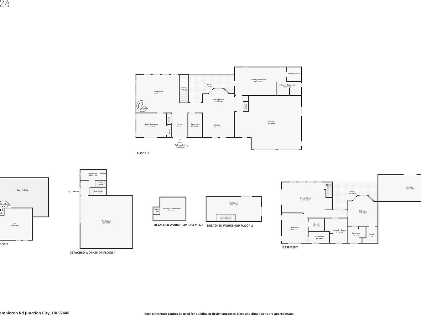This comprehensive floor plan reveals a multi-level home featuring an open layout on the main floor, including a spacious living room, dining room, kitchen, and guest bedroom. The primary bedroom with an en-suite and closet is positioned for privacy near the garage. The basement houses additional bedrooms, bathrooms, and a laundry room, connected by hallways for convenience. There’s also a detached workshop with three floors, including unfinished storage and a workspace. The upper level boasts a loft area for added flexibility. The layout prioritizes functionality, clear zoning between living and utility spaces, and ample storage.