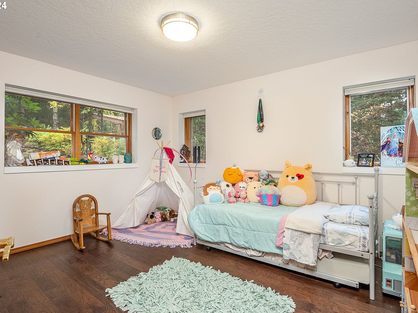 This cozy children’s bedroom corner features a light and airy palette with soft white walls and warm wood trim around the windows, complementing the dark hardwood flooring. A twin-sized metal bed with wheels is neatly made with pastel bedding and adorned with a collection of colorful stuffed toys. Adjacent to the bed, a whimsical small teepee sits on a lavender crocheted rug, creating a playful nook. Natural light floods the space through three rectangular windows, offering picturesque views of greenery outside. Additional touches include a small wooden rocking chair and a fluffy mint green area rug, creating a cheerful, inviting atmosphere.
