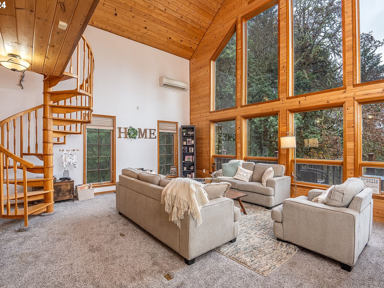 This spacious living area features a striking double-height wall of large, triangular and rectangular windows framed in natural wood, flooding the room with daylight and showcasing lush forest views. The vaulted ceiling and exposed wood beams add rustic charm, harmonizing with the wood-paneled upper walls. A wooden spiral staircase curves upward to an unseen second level, adding architectural interest. Soft gray carpeting offers warmth and texture underfoot, complementing the neutral-toned sofas and armchairs arranged around a simple wooden coffee table. Muted throw pillows and a draped knit blanket enhance comfort, while decorative signage and plants add inviting, homely touches.