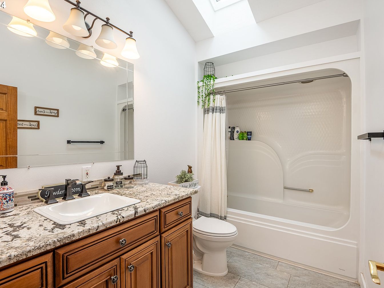 This bathroom features a well-lit vanity area with a large mirror bordered by four white light fixtures, creating a bright atmosphere. The vanity has warm wood cabinetry topped with a speckled granite countertop, integrating natural textures and neutral tones. An undermount sink with a modern black faucet complements the look. The adjacent shower/tub combination has a white surround with subtle curved detailing, paired with a simple cream and gray striped shower curtain. A skylight above adds generous natural light, enhancing the crisp white walls and pale gray tile floor. Decorative touches include greenery and small accent signs, contributing to a cozy yet clean aesthetic.