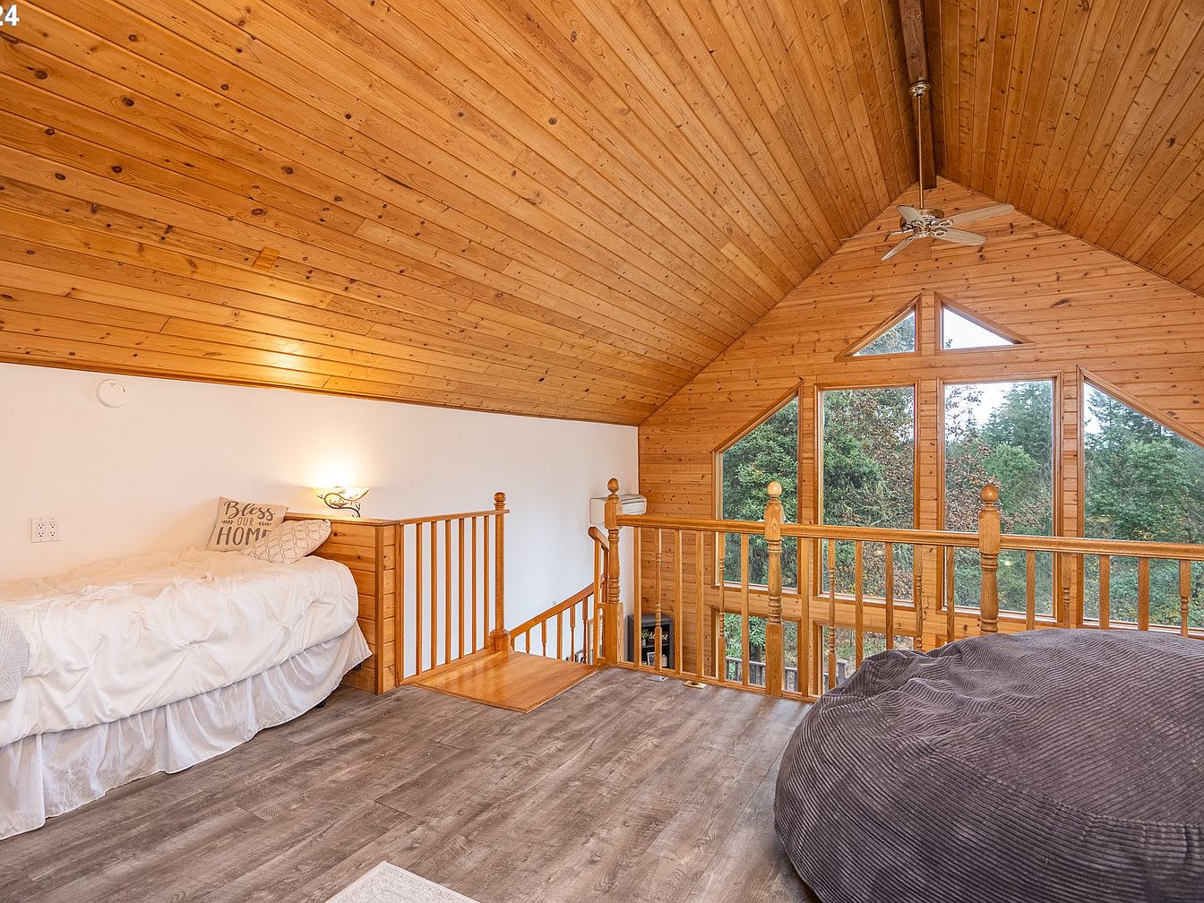 This cozy loft bedroom features a warm, rustic aesthetic dominated by natural wood elements. The vaulted ceiling and one wall are clad in rich pine planks, creating a cabin-like ambiance that contrasts beautifully with the smooth white painted wall. Large geometric windows flood the space with natural light and present a serene view of surrounding trees. The floor is covered in modern gray wood-look vinyl planks, adding a sleek touch to the room. Furnishing includes a white bed with a decorative pillow and a large textured gray bean bag, offering both comfort and casual relaxation. The wooden railing provides safety while preserving the open feel of the loft space.