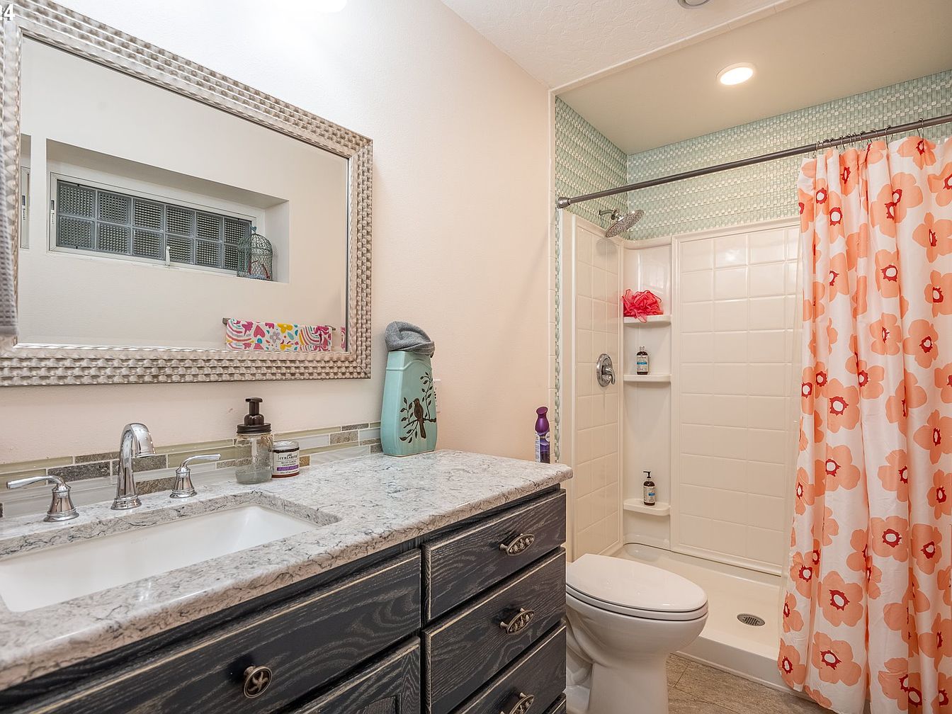 This bathroom features a compact yet thoughtfully arranged layout, with a sleek vanity topped by a white and gray marbled countertop paired with a rectangular under-mount sink. The dark wood cabinetry adds a rustic touch, accentuated by antique-style hardware. Above the sink, a large textured silver-framed mirror enhances the sense of spaciousness. The shower area is modest, enclosed with white tiled walls and a curtain adorned with bold coral and orange floral patterns, injecting playful color. Light aqua mosaic tile borders the shower wall, harmonizing with the subtle neutral beige walls, creating a fresh, cozy atmosphere.