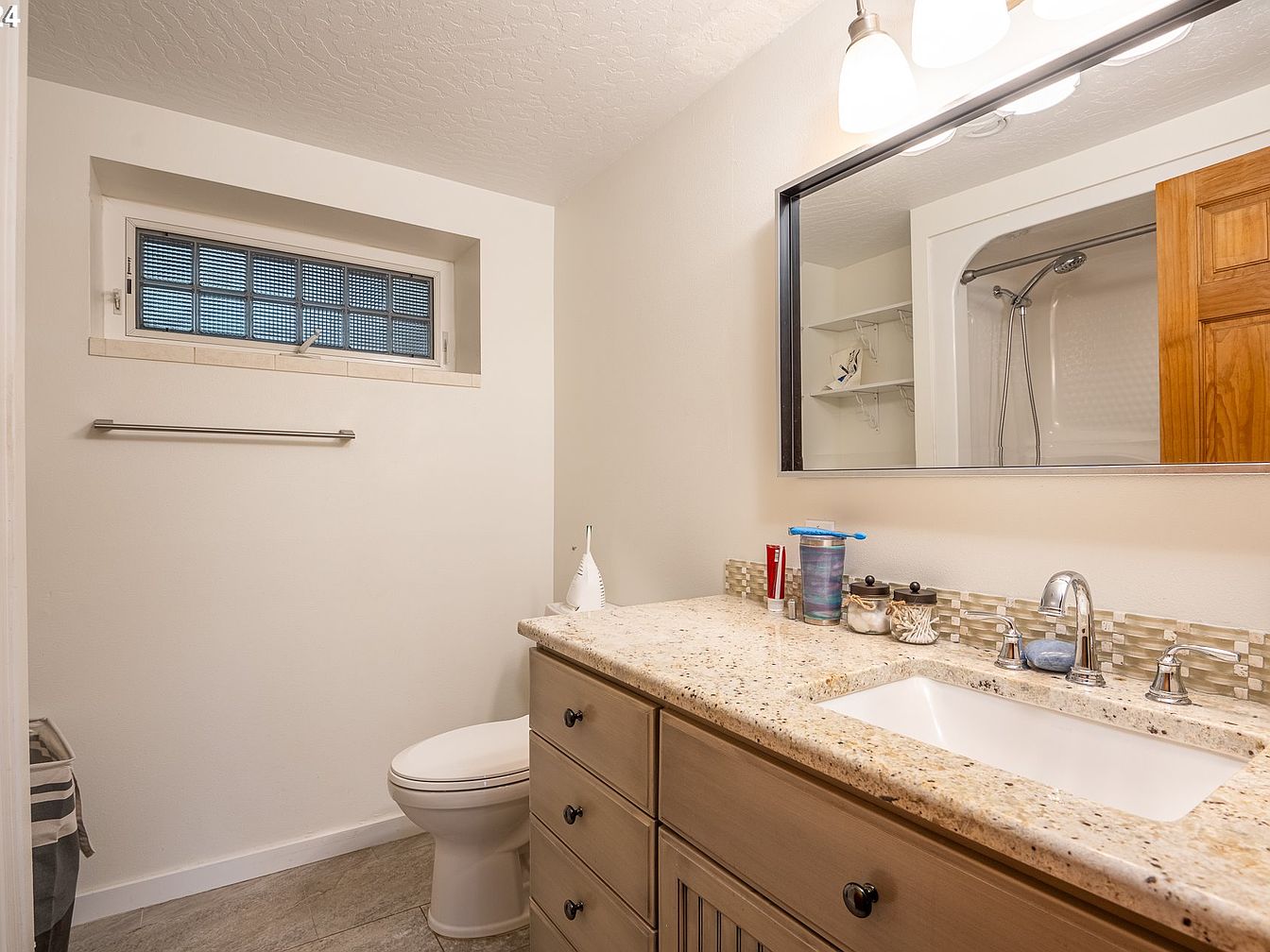 This bathroom features a compact yet functional layout with light neutral walls that create a fresh, airy ambiance. A rectangular window with textured glass blocks allows natural light while maintaining privacy. The vanity boasts a granite countertop with warm beige tones, complemented by a white rectangular under-mount sink and polished chrome faucets. The cabinetry, in a natural wood finish, adds rustic charm with black knobs for contrast. Above the sink, a large black-framed mirror is illuminated by a fixture with three frosted glass shades. The flooring is subtly textured in gray tones, unifying the space with understated elegance.