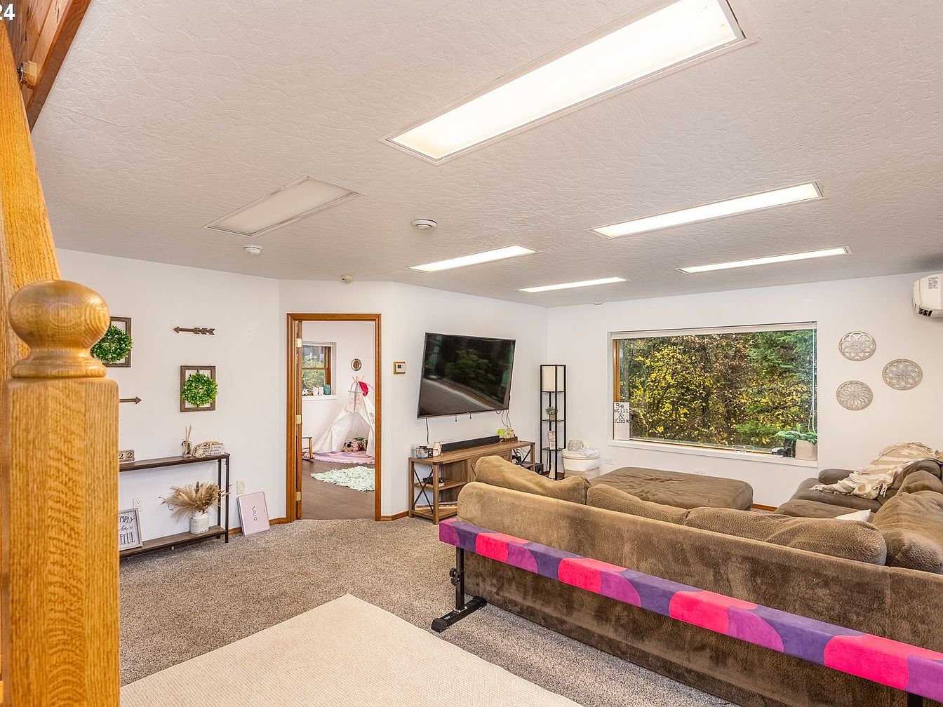 This cozy family room features a spacious brown sectional sofa adorned with a colorful bench cushion, positioned to face a wall-mounted flat-screen TV. The walls are painted crisp white, creating a bright and fresh atmosphere. A large window offers a scenic view of lush greenery outside, inviting natural light to complement the modern ceiling lighting panels. Wood trim around doorways and windows adds warmth, while decorative greenery and simple wall art enhance the inviting and comfortable feel. Plush carpeting underfoot ties the space together, perfect for family relaxation or entertainment. An adjoining room with playful decor suggests a family’s thoughtful layout.