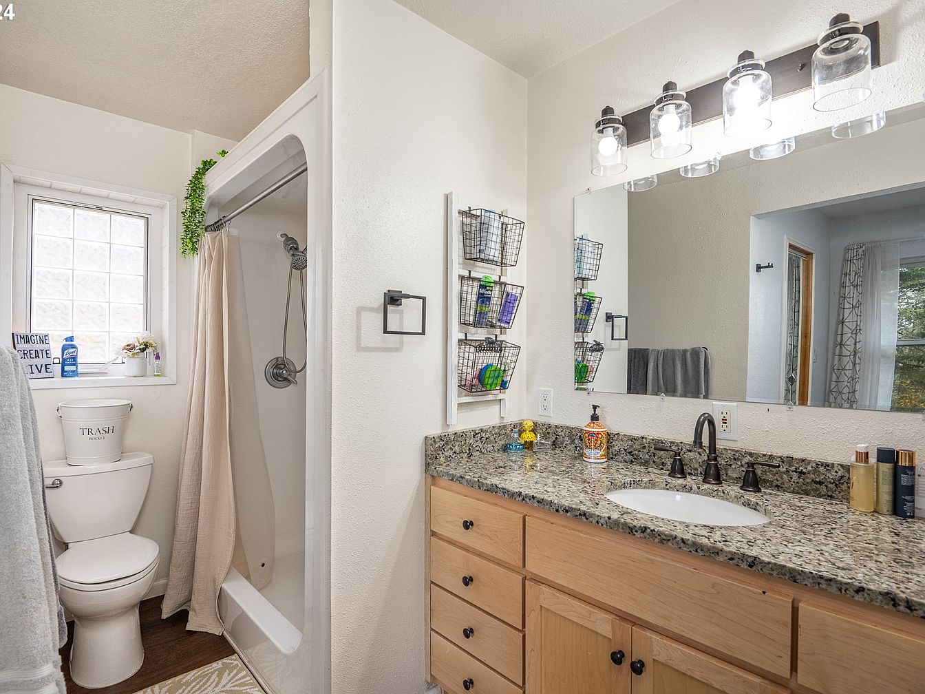 This bathroom features a clean and functional layout with light-colored walls and natural wood cabinetry. The granite countertop adds elegance, complemented by dark bronze fixtures on the undermount sink. A large rectangular mirror overhead reflects bright light from a modern four-bulb vanity fixture with glass shades, ensuring ample illumination. The compact shower enclosure is tucked neatly beside the toilet, outfitted with a neutral beige shower curtain. Positioned near a window with frosted glass blocks, the space receives natural light, while minimalist metal storage baskets mounted beside the mirror maximize organizational efficiency. Decorative touches add warmth and charm.