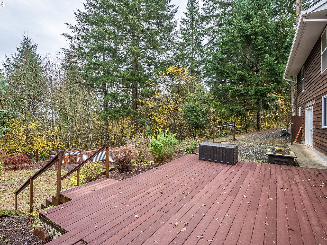 This outdoor space features a spacious wooden deck stained in a deep reddish-brown tone, bordered with simple wooden railings and steps leading down to the yard. The deck is minimally adorned with a large, dark storage box, emphasizing functionality and openness. Surrounding the deck is a natural garden area with a mix of deciduous and evergreen trees, showcasing rich greenery interspersed with autumnal yellow leaves. The house’s exterior is clad in brown siding with white trim around windows and doors, adding a rustic charm. The earthy palette and forested backdrop create a serene, nature-integrated atmosphere.