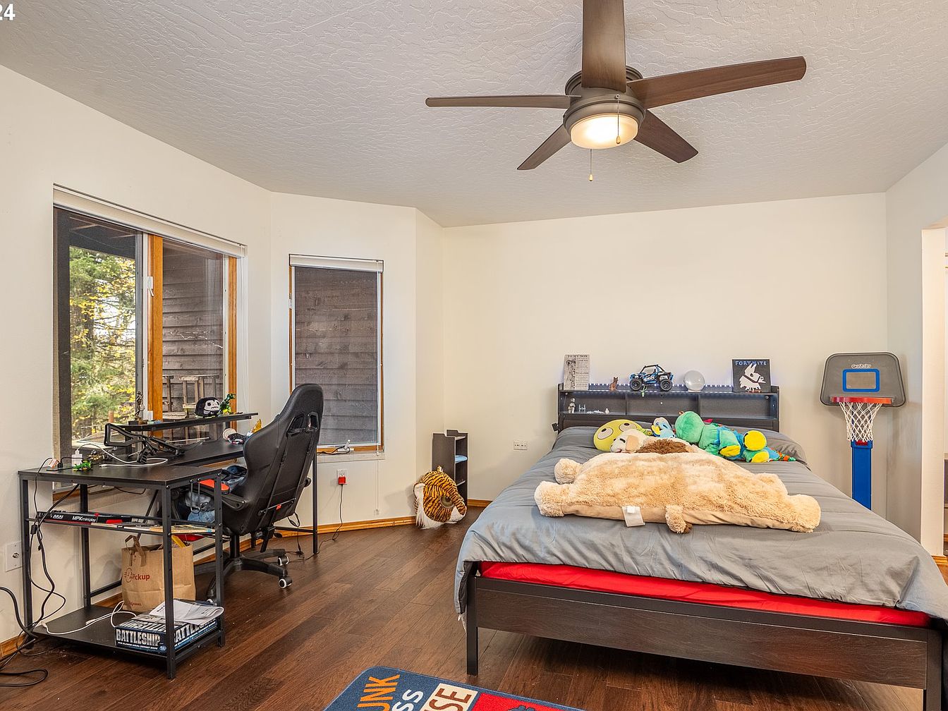 This bedroom features a simple, functional layout with a focus on comfort and productivity. A dark wood bed with a gray comforter and colorful plush toys sits against a plain white wall, highlighting minimalistic design. The flooring is a rich, dark wood that complements the darker furniture tones. To the left, a modern black desk setup with a sleek black gaming chair faces two large windows that bring natural light into the room. A ceiling fan with wooden blades hangs in the center, providing a practical touch to the space. The room exudes a cozy yet youthful vibe with subtle hints of personal interests and leisure.