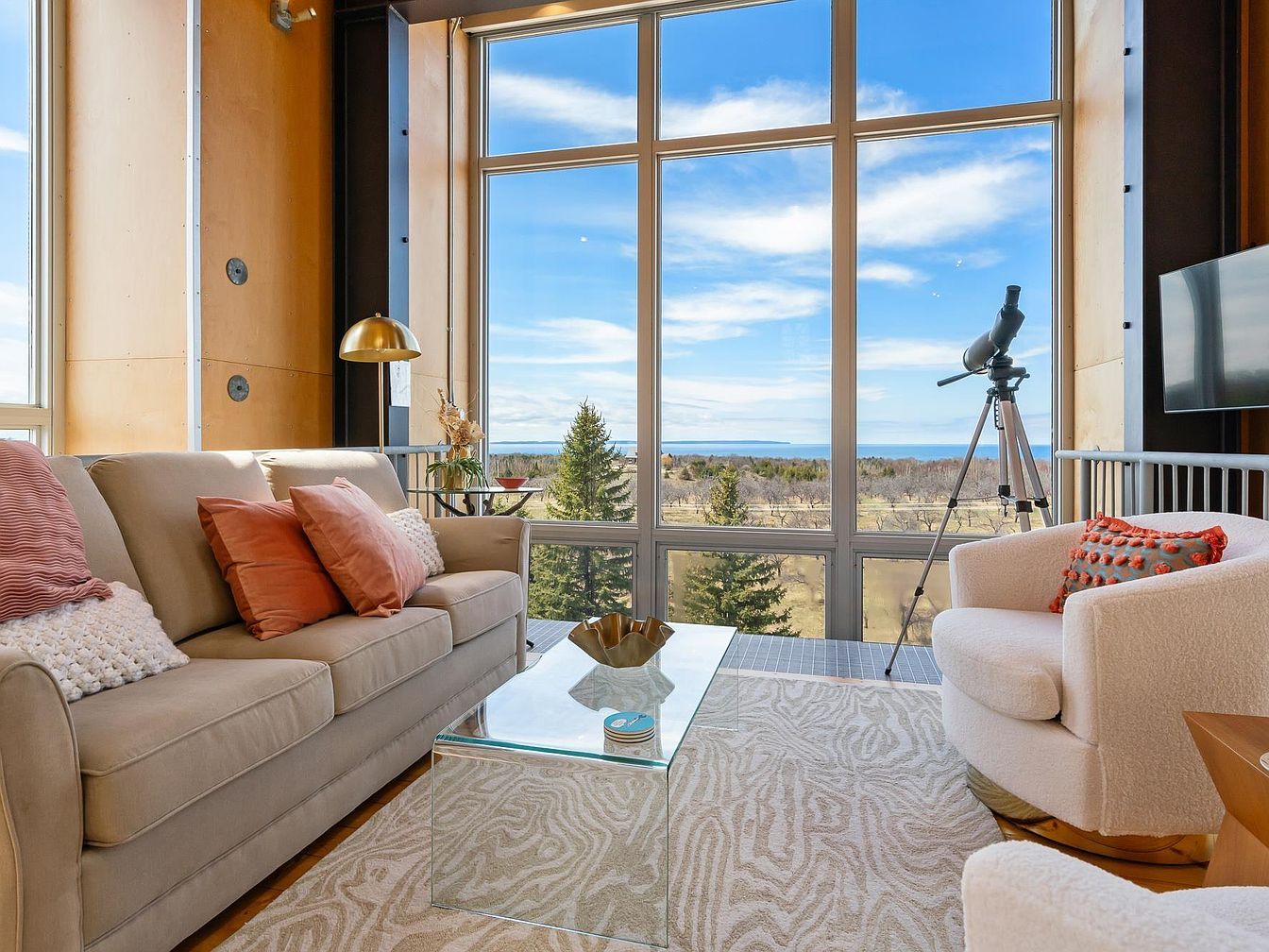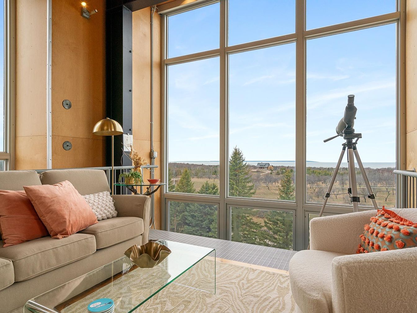 This cozy living room is centered around a stunning floor-to-ceiling window wall, offering expansive views of an orchard, distant trees, and a serene body of water under a bright blue sky. The seating arrangement includes a beige sofa with terracotta-colored pillows on the left and a plush, rounded armchair with a textured orange and gray cushion on the right, creating a warm, inviting space. A glass coffee table with a sculptural centerpiece complements the soft neutral rug beneath. Architectural wooden paneling surrounds the window frame, blending natural elements with modern comfort. A telescope on a tripod invites observation of the outdoors, while a sleek brass floor lamp adds a touch of elegance and additional lighting. The room’s design expertly balances functionality, comfort, and breathtaking nature views.