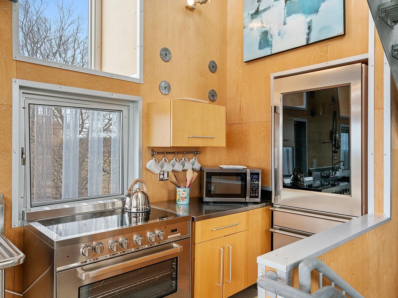This kitchen corner blends modern industrial elements with natural warmth. The space features light wood cabinetry paired with stainless steel appliances including a stove, microwave, and large oven with a reflective glass door. The countertops are also stainless steel, enhancing the sleek, clean vibe. Natural light filters in through two windows framed with metal, one set high and narrow and the other directly above the stove, offering scenic views. Functional details like hanging white mugs on a metal rod and a colorful utensil holder add personality. The high walls and minimalist art elevate the room’s contemporary but cozy aesthetic.