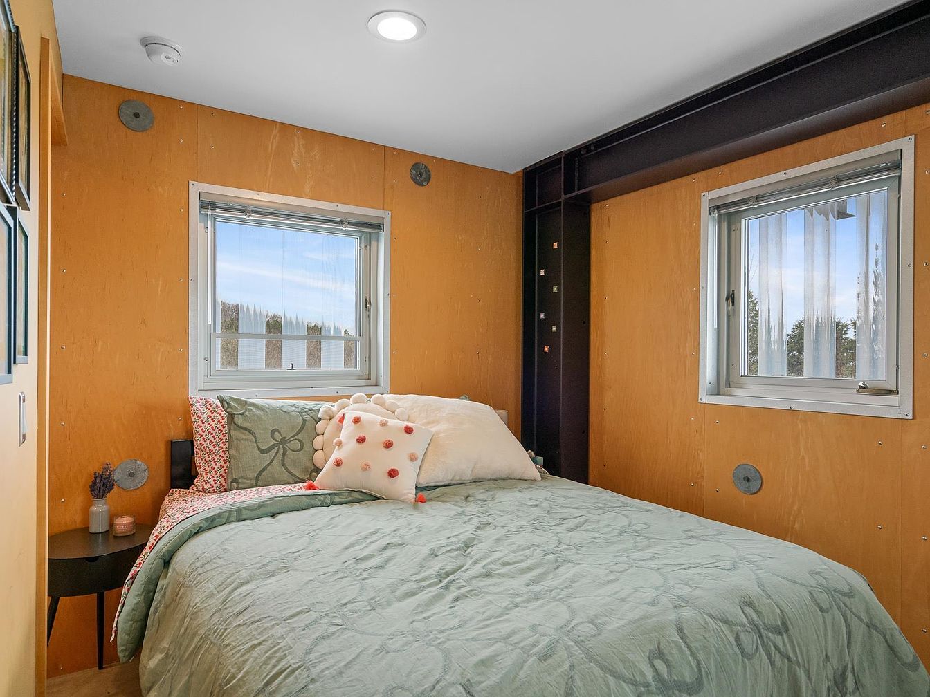 This bedroom space features warm wood-paneled walls with visible screws and industrial-style round metal plates, creating a blend of rustic and modern aesthetics. Two small windows framed in white metal allow natural light to fill the room, providing a view of greenery outside. A full bed with a muted green quilt and patterned pillows creates a cozy and inviting bed area. The room includes a simple black side table adorned with minimal decor, and a dark structural beam runs vertically and horizontally on the wall, adding architectural interest to this compact, functional, and warm retreat.
