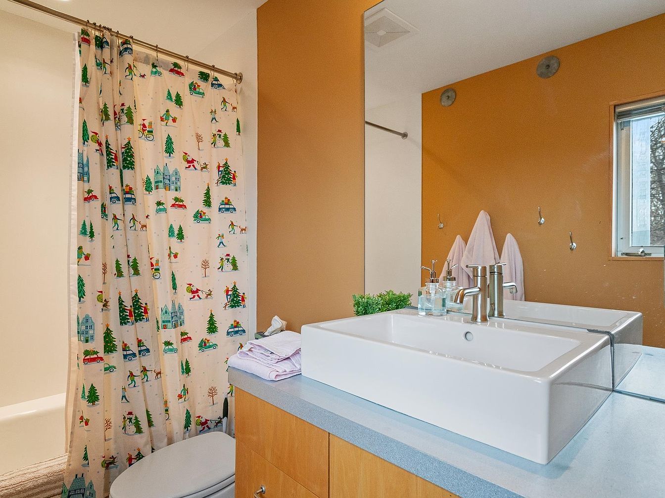 This bathroom features a vibrant warm orange accent wall contrasting with neutral beige tones around the tub area. A playful shower curtain displays whimsical holiday-themed illustrations, adding a charming and festive vibe. The vanity has a modern look with a wide rectangular white sink atop a light wooden cabinet, enhanced by a smooth light blue countertop. Polished chrome fixtures and clear glass soap dispensers add a sleek, contemporary touch. A large mirror extends across the vanity wall, reflecting natural light from the nearby window, making the space feel brighter and welcoming. Three towel hooks with white towels add functional convenience.