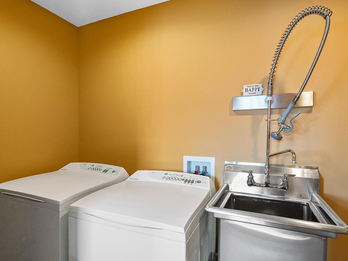 This laundry space features a clean and functional design with a warm golden-yellow painted wall as a backdrop. Two white top-loading machines—likely a washer and dryer—sit side by side for convenience. Adjacent to them is a large stainless steel utility sink equipped with a high-arc, spring-coiled faucet, ideal for heavy-duty cleaning tasks. The deep basin and industrial-style fixtures blend durability with utility. Above the sink, a small shelf holds a decorative sign, adding a touch of personality. The minimalist setup emphasizes practicality while maintaining a cheerful and inviting atmosphere.