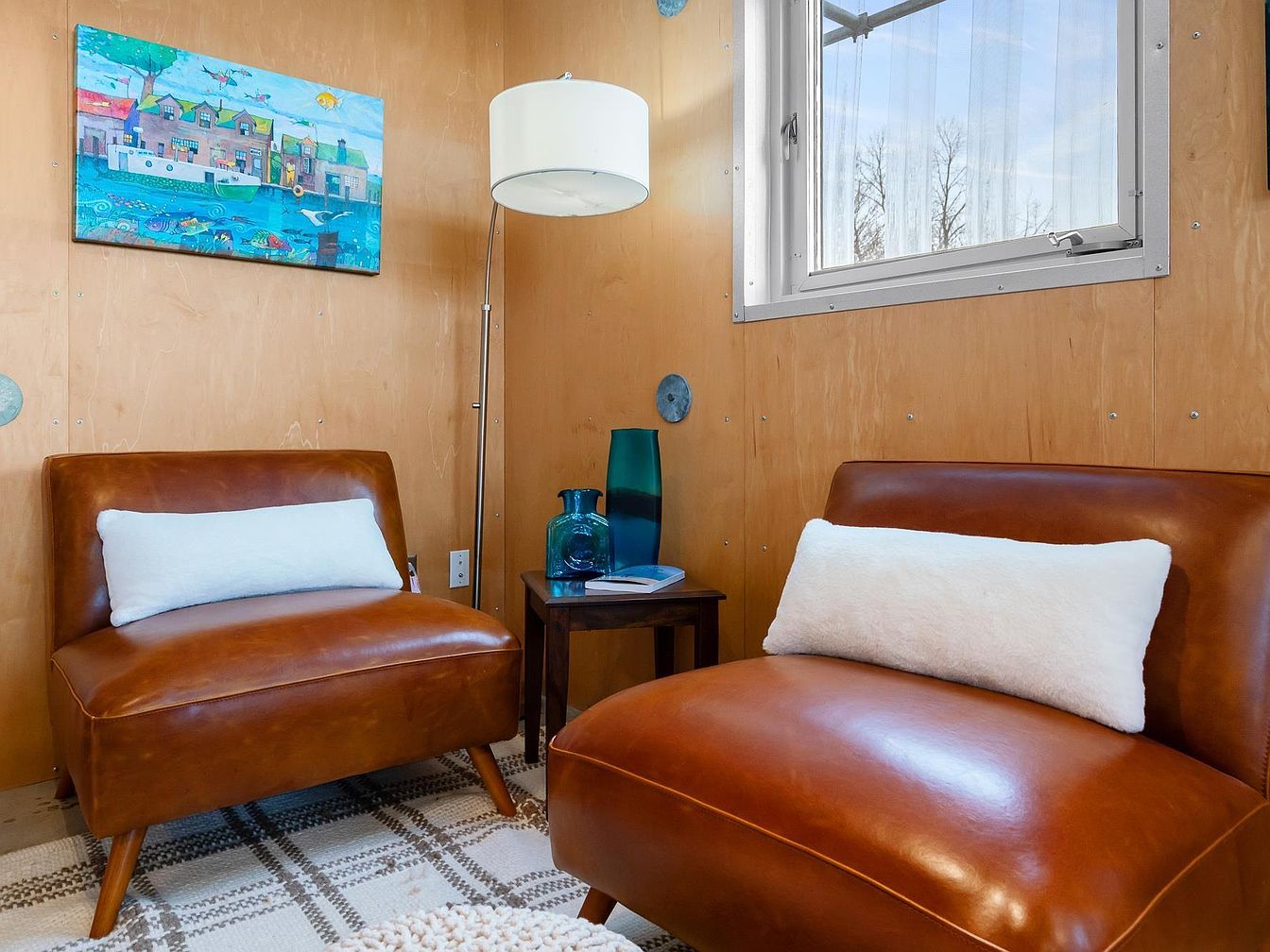 This intimate corner features two mid-century modern-inspired caramel leather chairs, each adorned with a long, plush white lumbar pillow for contrast and comfort. Positioned between the chairs is a small dark wood side table holding decorative blue glass vases and an open book, adding a touch of sophistication. The walls are paneled with warm, natural wood, accented by visible screws that contribute to a minimalist, rustic aesthetic. A bright painting with aquatic and coastal themes introduces vibrant color above one chair. A tall, slender floor lamp with a white drum shade provides gentle illumination, while a window allows natural light to filter through sheer curtains, enhancing the cozy, inviting atmosphere. A patterned rug beneath anchors the space with subtle neutral tones and texture.