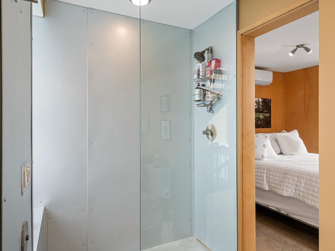 This compact bathroom section features a minimalist walk-in shower with frosted glass panels, creating a clean and modern aesthetic. The fixtures are sleek with a brushed metal finish, complementing the contemporary design. A wall-mounted shower caddy holds various toiletries, adding practical storage. Through the open wooden doorway, a glimpse into the adjacent bedroom reveals a cozy space with a white quilted bedspread and neutral-toned pillows, enhanced by warm wood walls that provide a stylish contrast to the cool tones of the shower. The overall look is functional yet inviting with a balance of warm and cool elements.