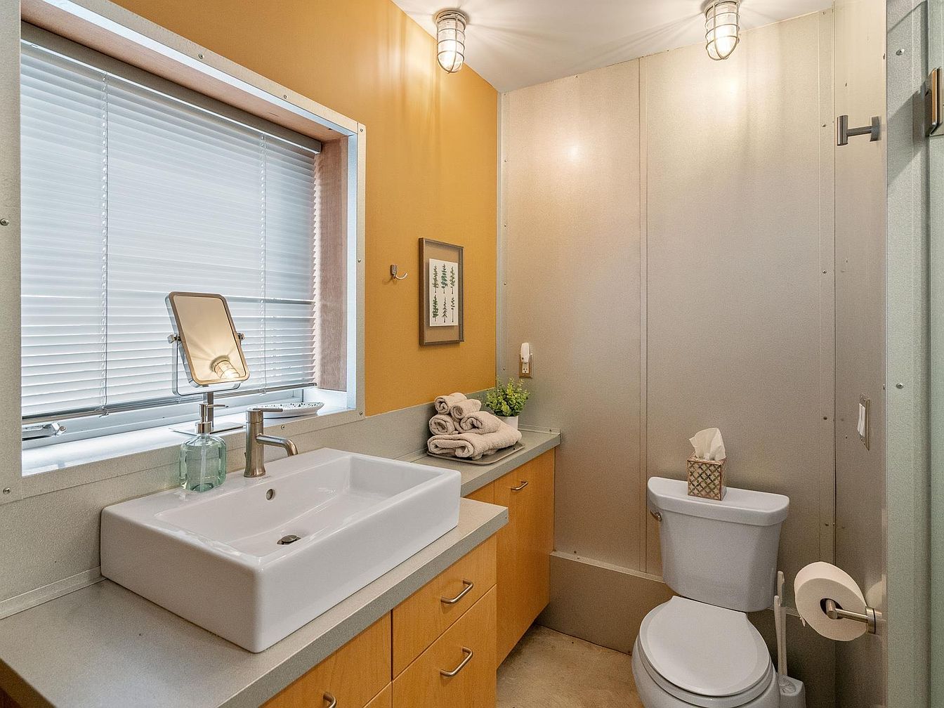 This compact bathroom offers a clean, modern aesthetic with a practical layout. Light wood cabinetry under a smooth gray countertop provides ample storage and surface space. A large rectangular white ceramic sink sits prominently, paired with a simple brushed metal faucet. The wall features a bold mustard accent, contrasted with neutral gray metal panels adding an industrial touch. Two nautical-style wall sconces offer warm, focused lighting. Accessories include neatly folded beige towels, a small green plant, and a framed botanical print, enhancing the space’s cozy and inviting feel. A white toilet with a decorative box of tissues completes the room.