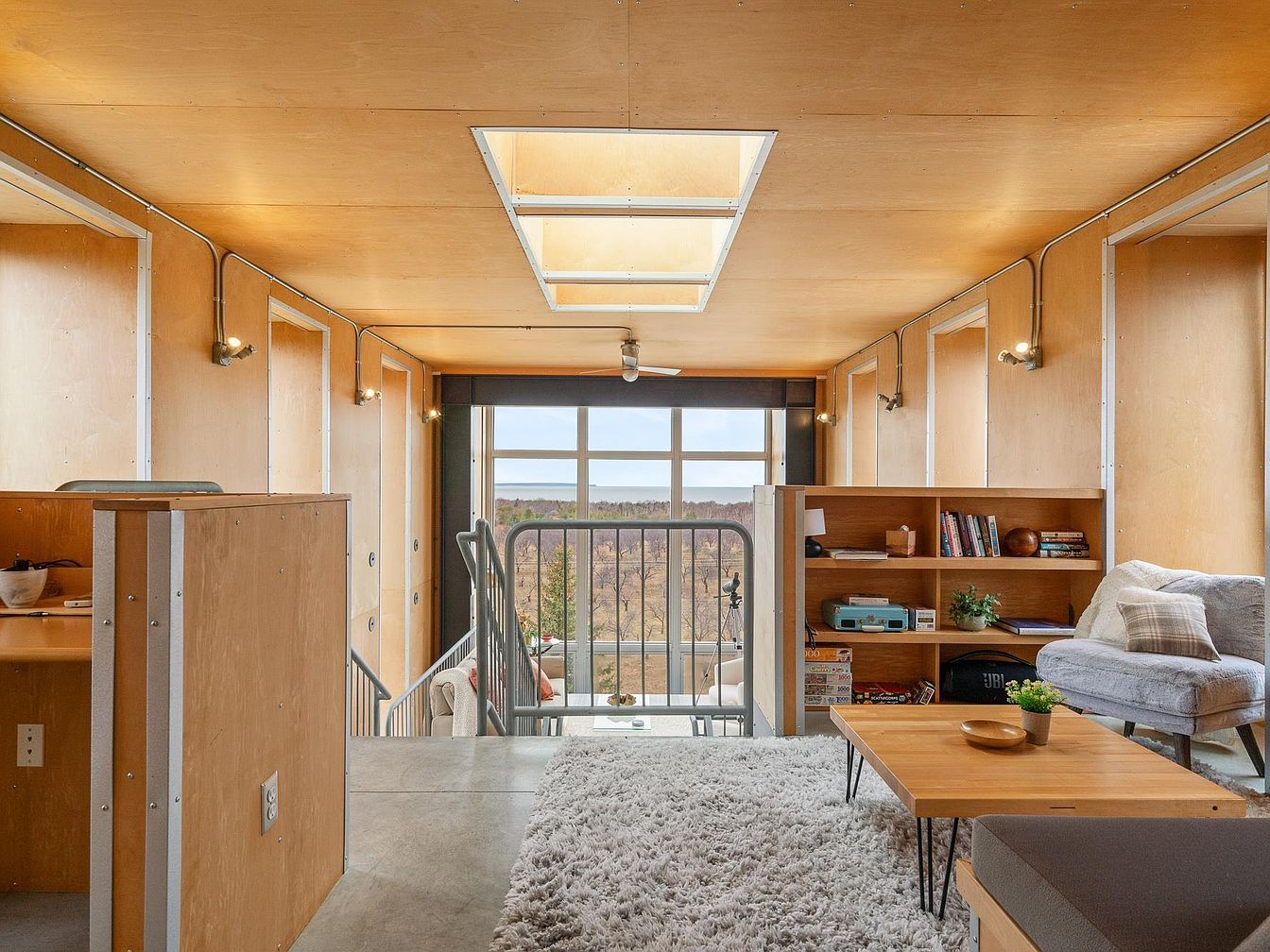 This loft area is characterized by a warm wood-paneled ceiling and walls, accented with metal framing and exposed conduit lighting that lends an industrial yet cozy atmosphere. A centrally placed skylight enhances natural light overhead, complementing the expansive floor-to-ceiling window at the far end, which offers sweeping views of treetops and horizon beyond. The space is divided into a casual seating zone with a plush, textured white rug beneath a wooden coffee table with hairpin legs, surrounded by a light gray plush chair and a built-in wooden bookshelf filled with books and decor. Concrete flooring and minimalist furniture complete the modern, functional aesthetic.