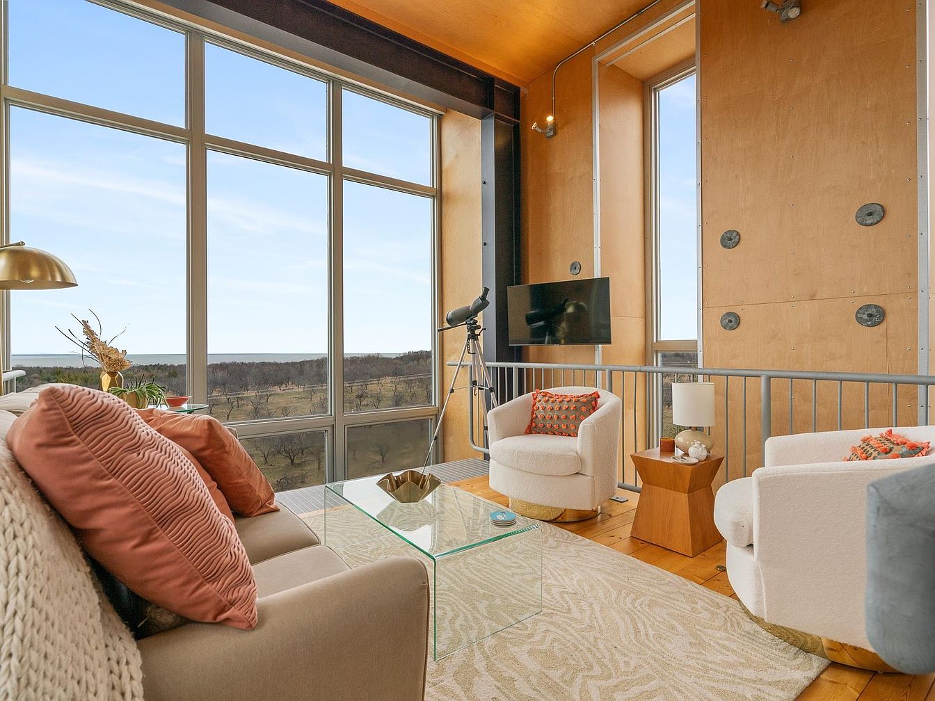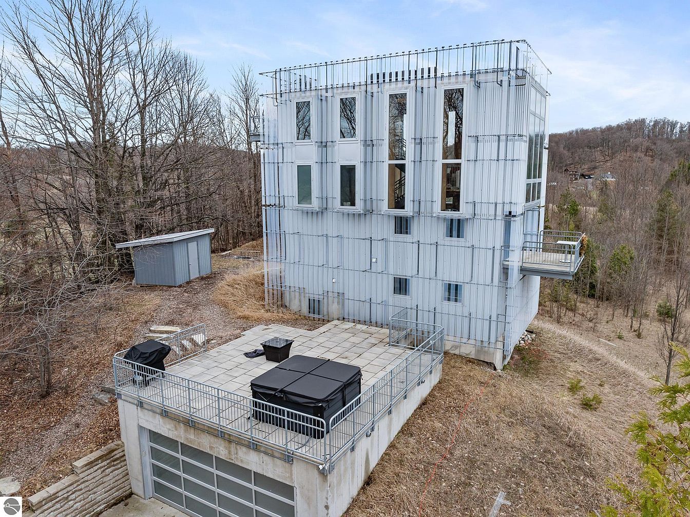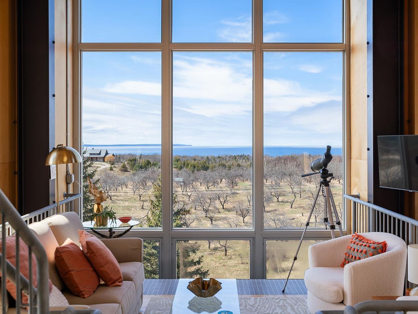The Chameleon House is an award-winning example of modern-industrial architecture, designed by San Francisco’s Anderson Anderson Architects. Located in Northport, MI, this home sits on a one-acre hillside with breathtaking westward views of Lake Michigan, the Manitou Islands, Fox Islands, and The Crib Lighthouse. Constructed using steel I-beams and structural insulated panels, the home combines innovative engineering with energy efficiency. Inside, warm birch wood panels soften the clean, contemporary design. The home features a primary suite, two guest bedrooms, multiple bathrooms, and a loft-style executive office complete with its own bath. A rooftop deck at the top offers private, unbeatable sunset views over the lake, perfect for relaxing and entertaining. The listing price is $1,250,000.