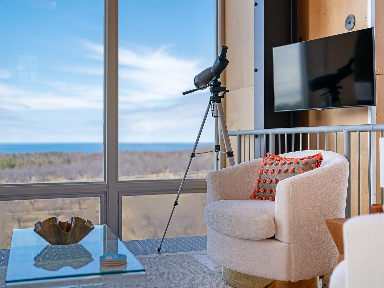 This corner of the home offers a serene and inviting space designed for relaxation and enjoying scenic views. A large window wall frames an expansive outdoor vista featuring a clear blue sky and distant treetops. The space features a plush, rounded armchair upholstered in a soft, textured white fabric, accented with a decorative pillow that incorporates warm orange tones, adding a subtle pop of color. Nearby, a sleek black telescope on a silver tripod invites stargazing or nature observation. A glass coffee table with a sculptural centerpiece complements the modern aesthetic, while a mounted flat-screen TV provides entertainment options without disrupting the tranquil ambiance.