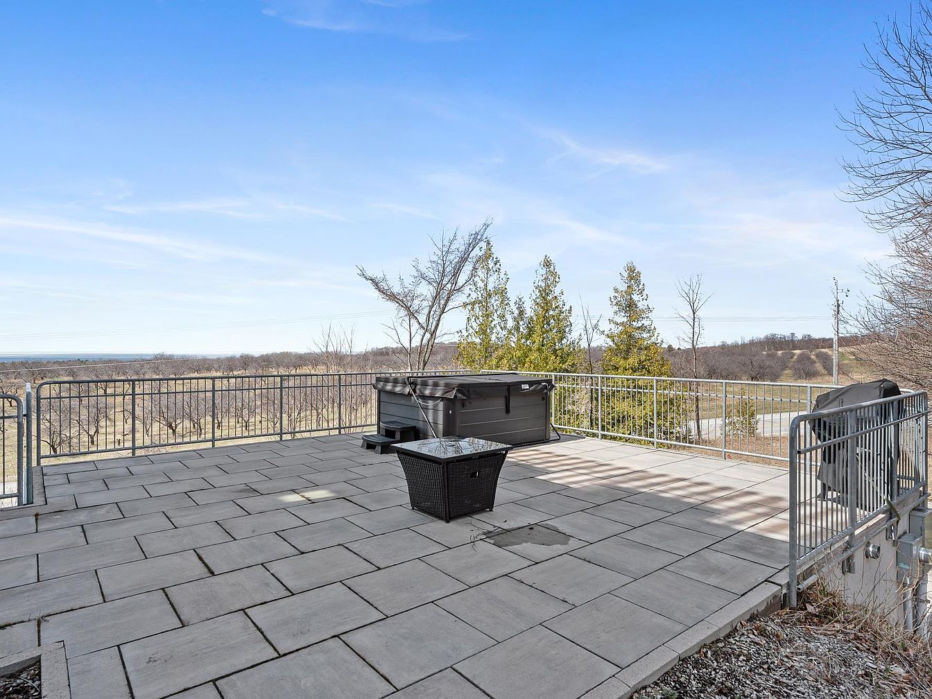 This expansive outdoor patio features large, light-gray stone tiles arranged in a modern pattern, providing a durable and elegant foundation. The space is bordered by simple metal railings, offering safety without obstructing the breathtaking panoramic views of rolling hills and open countryside in the distance. A covered hot tub sits in one corner, perfect for relaxing while enjoying nature, accompanied by a small black wicker fire pit table that adds a touch of warmth and coziness to the otherwise minimalist design. The area invites outdoor entertaining and peaceful retreats under a clear blue sky.