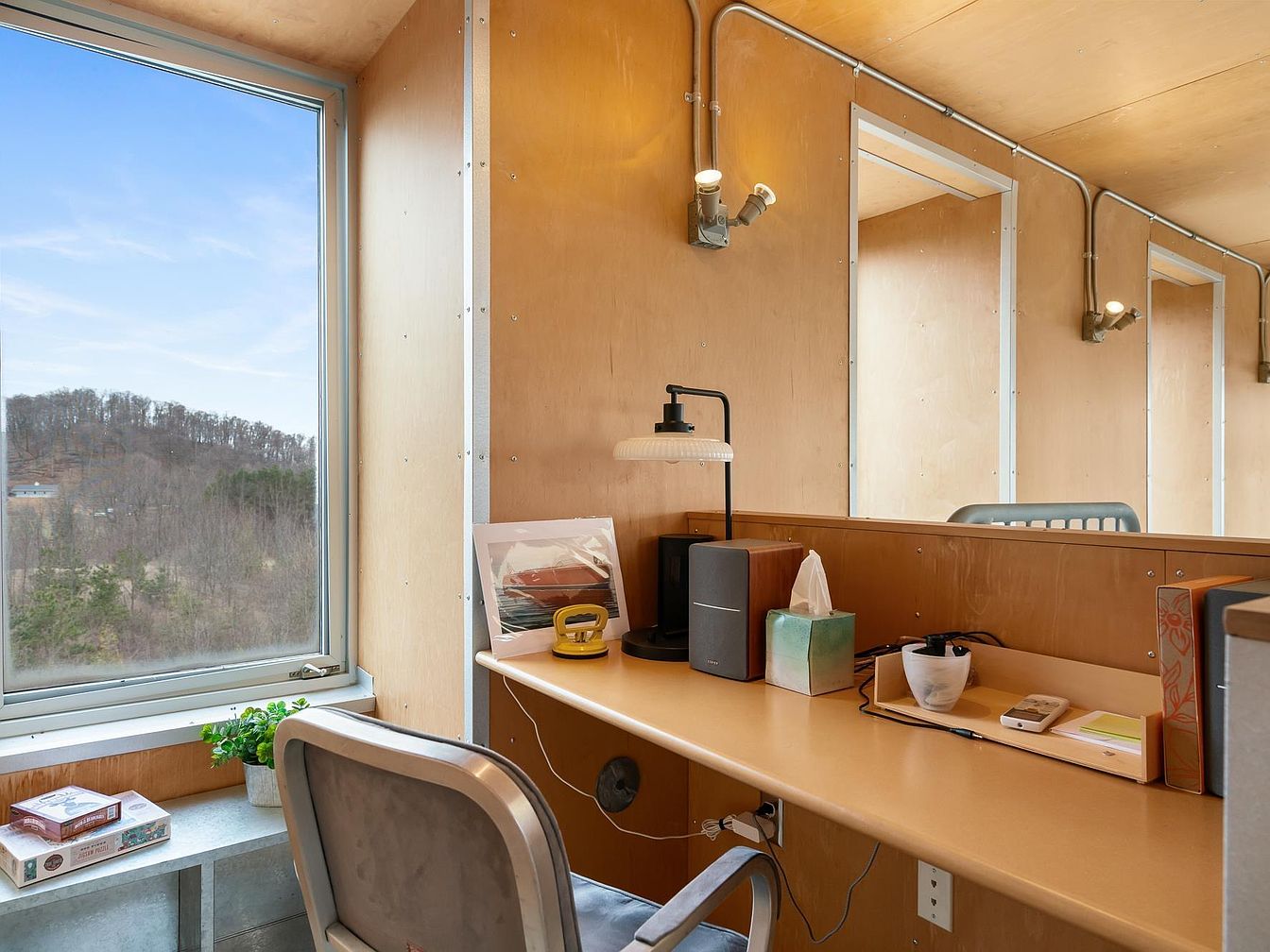 This compact home office nook features a minimalist design with warm wood-paneled walls and ceiling highlighted by exposed metal framing and electrical conduit for an industrial touch. The built-in desk provides ample workspace with neutral beige tones that blend seamlessly into the setting. A large window lets in natural light and offers a serene view of wooded hills, enhancing the room’s calming atmosphere. Functional accessories like a black desk lamp, Bluetooth speaker, and organized stationery holder complement the workspace. A simple gray chair and small greenery add subtle comfort and liveliness to the space.