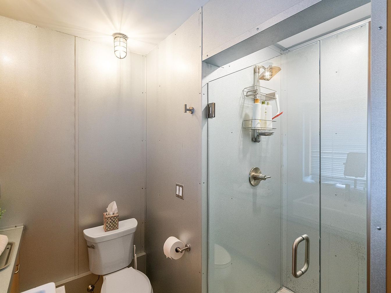 This compact bathroom features a modern and utilitarian design with metallic silver walls that give an industrial vibe. The shower area is enclosed with frosted glass doors and stainless steel fixtures, highlighting a sleek and clean aesthetic. A simple mounted shelf holds toiletries, maintaining order and minimalism. The white toilet sits adjacent to the shower, complemented by a wall-mounted toilet paper holder and a single hook for towels or robes. Soft lighting from a ceiling fixture casts a warm glow, balancing the industrial elements with a cozy atmosphere.