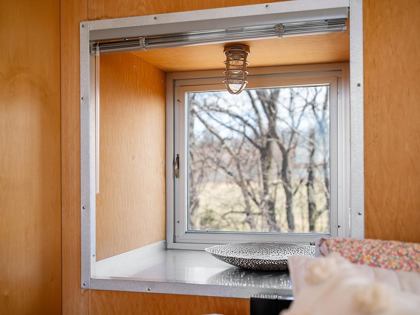 This cozy window nook features a framed, rectangular window that offers a clear view of the bare trees outside. The walls and ceiling surrounding the nook are covered in warm, honey-toned wood panels, creating a natural and inviting atmosphere. A sturdy metal frame outlines the window, adding an industrial touch alongside the protective cage around the overhead light fixture. The white windowsill surface holds a decorative, textured metal tray, adding subtle artistry and contrast. Soft cushions with floral and neutral patterns enhance comfort, suggesting this spot is perfect for quiet reflection or relaxation while enjoying the outdoors through the glass.