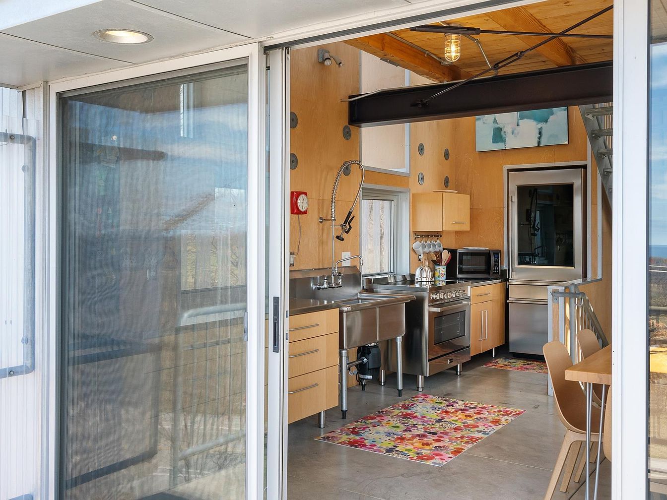 This kitchen features a sleek, industrial-inspired design with stainless steel appliances and fixtures, including a large double sink and a modern stove. Light wood cabinetry with minimalist hardware complements the wood-paneled walls, adding warmth and texture. Colorful floral rugs soften the concrete floor, providing a lively contrast to the neutral tones. The space benefits from natural light streaming through sliding glass doors, which connect it to a balcony area. Exposed structural elements such as a steel beam and ceiling wood accents enhance the contemporary aesthetic, while a minimalist dining area with light wood chairs sits adjacent to the kitchen space.