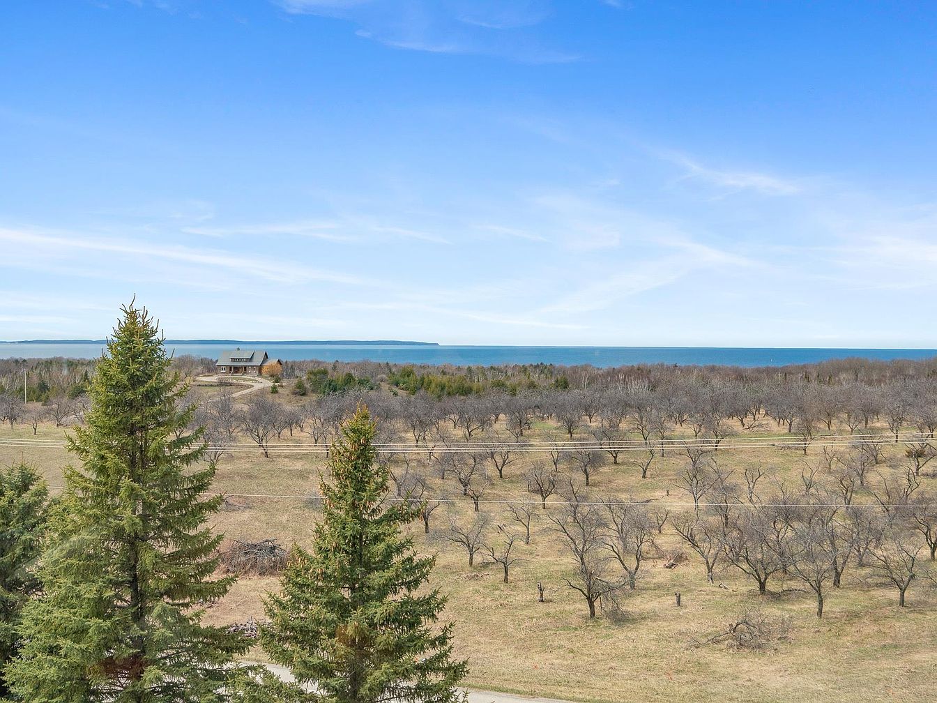 This expansive view showcases a rural property with a charming house nestled in the distance. The landscape features rows of leafless trees, likely an orchard, stretching across gently rolling fields. Tall evergreen trees in the foreground add depth and greenery, contrasting with the muted earth tones of the orchard. Beyond the property, a large body of water extends across the horizon under a clear blue sky, offering a peaceful, serene atmosphere. The winding driveway leading to the home suggests privacy and intimacy amid the vast natural surroundings, inviting a quiet, rural lifestyle.
