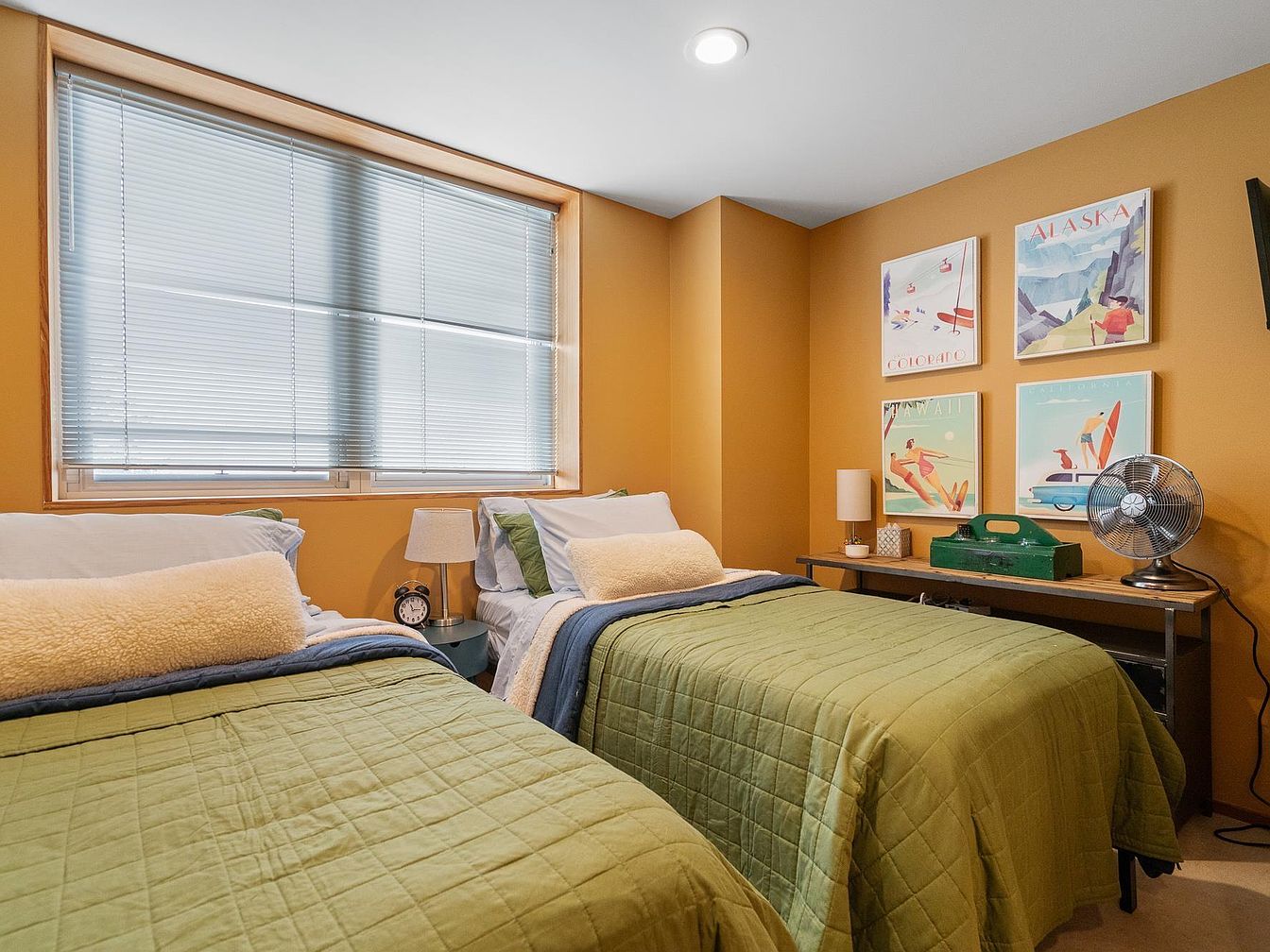 This welcoming bedroom features two twin beds arranged parallel with quilted olive green bedding and layered pillows, including plush cream bolsters for added comfort. The walls are painted a warm mustard yellow, which harmonizes with the natural wood window frame and creates a cozy atmosphere. A wide window with white horizontal blinds brightens the room while offering privacy. The room’s minimalist decor includes a small side table between the beds with a modern lamp and an alarm clock. Opposite the beds, a sleek console table holds a retro metal fan and a green toolbox, beneath four framed vintage posters showcasing travel destinations that add a playful, nostalgic touch.