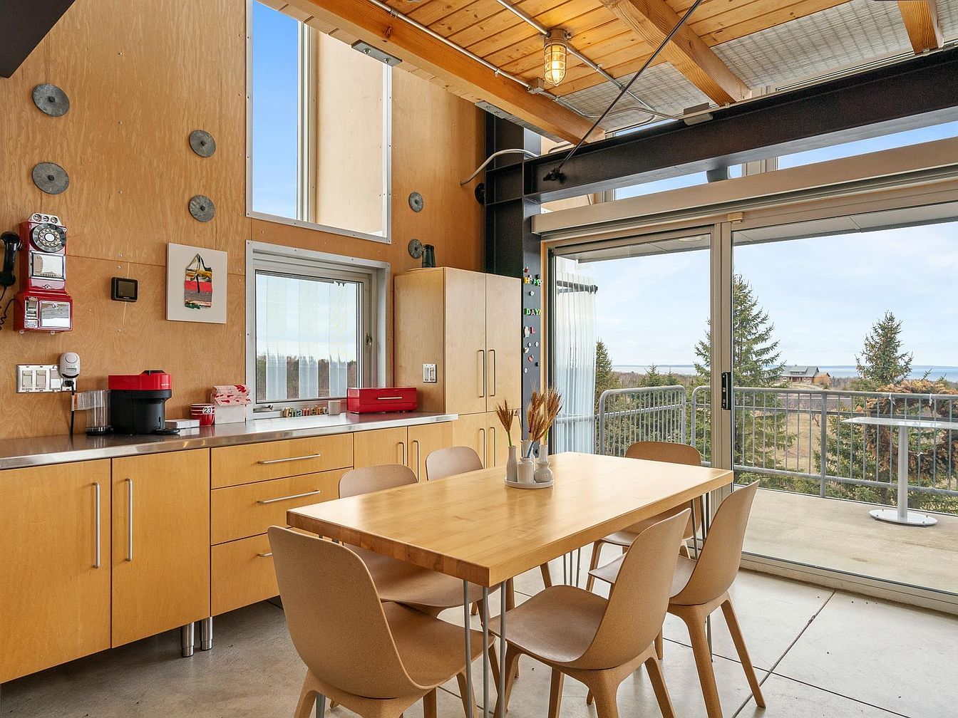 This intimate dining space features a natural wood table surrounded by six sleek, curved chairs in a soft beige tone, creating a warm and inviting setting. The room is framed by expansive sliding glass doors that lead to a balcony with scenic views of trees and distant water. Light wood cabinetry with modern metal handles lines one wall, topped with a stainless steel countertop. The walls exhibit a minimalist plywood finish with industrial metal fixtures and a vintage-style red rotary phone adding character. Exposed wooden beams and concrete floors complete the modern yet cozy design.