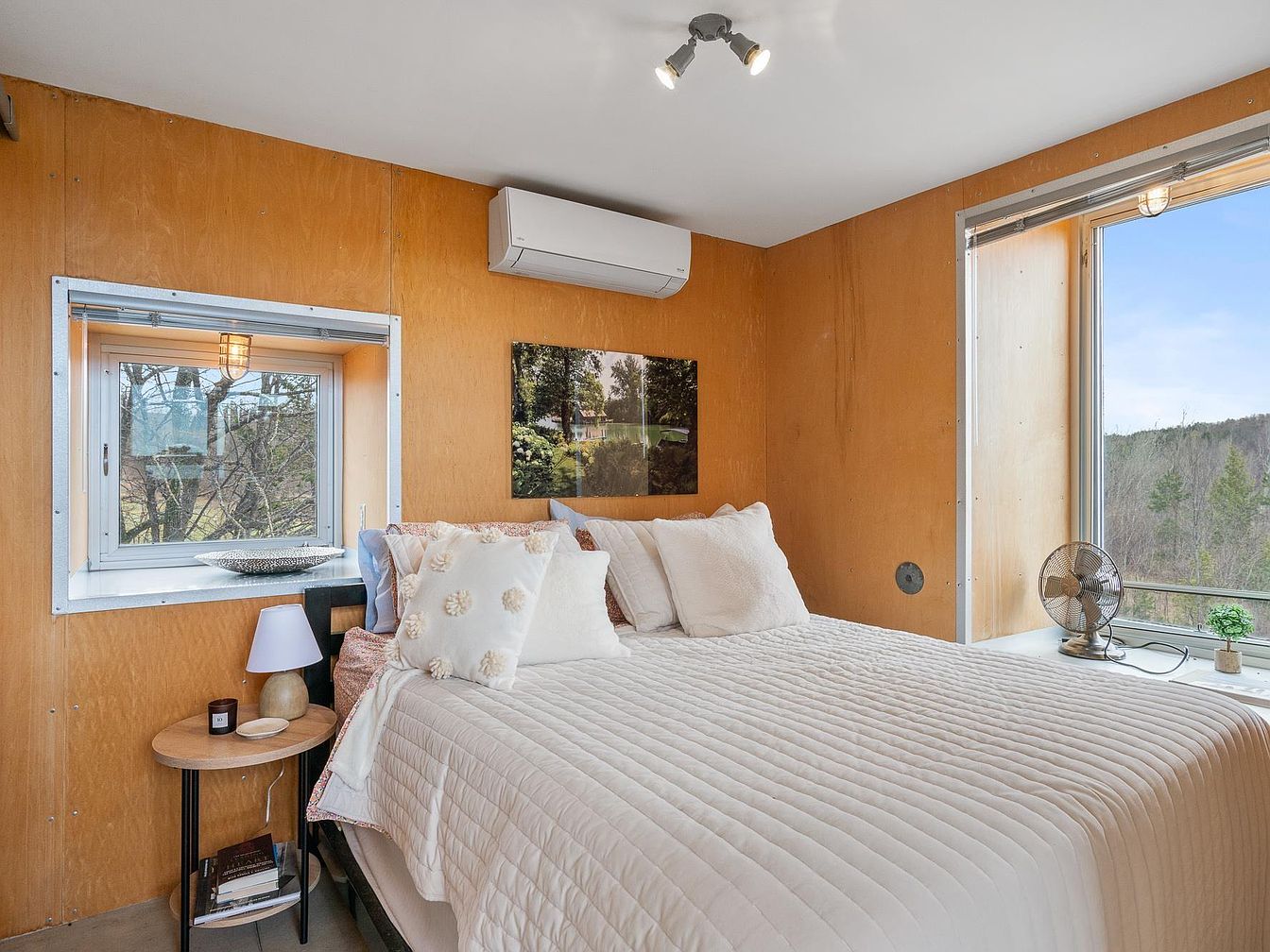 This compact bedroom features a warm, natural wood-paneled interior that contrasts beautifully with the crisp white bedding and pillows that create a welcoming and restful atmosphere. The bed is positioned to take full advantage of the two large windows, allowing an abundance of natural light and scenic views of the trees and hills beyond. A minimalist, round bedside table with a lamp and a few decorative items complements the clean aesthetic. The white ceiling with a small spotlight fixture adds modernity, while a discrete wall-mounted air conditioning unit ensures comfort. The simple, serene decor emphasizes relaxation and connection with nature.