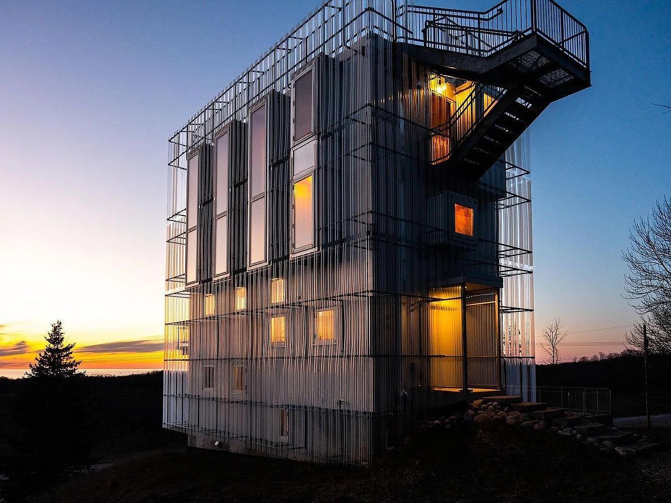This striking modern home is captured at twilight, showcasing a unique cubic structure enveloped by a translucent mesh facade. The exterior design emphasizes vertical lines with evenly spaced, elongated windows that emit a warm, inviting glow from inside. An industrial-style metal staircase with a railing ascends externally, adding an architectural focal point while providing functional access to upper levels. The color scheme contrasts the cool blue dusk sky with warm, golden light from within, highlighting the home’s contemporary, minimalist aesthetic. Surrounding natural landscape elements enhance the serene, isolated ambiance.