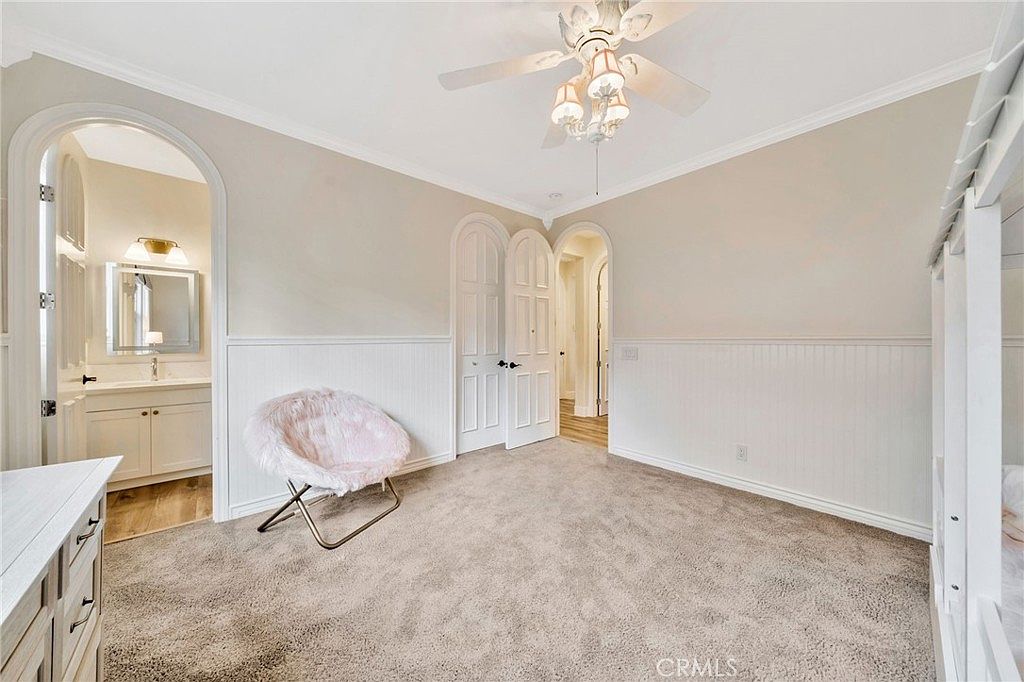 This cozy bedroom corner features soft beige carpeting complementing neutral taupe walls adorned with white wainscoting that adds subtle texture and traditional charm. Two elegant arched doorways frame the space: one leading to a bathroom with warm wood flooring and a vanity illuminated by a brass light fixture, and another opening into a hallway with light wood flooring. A plush, furry round chair with a modern metal frame offers a cozy seating spot. The ceiling fan with ornate light fixtures enhances the room’s classic yet comfortable ambiance, blending functionality with timeless style.