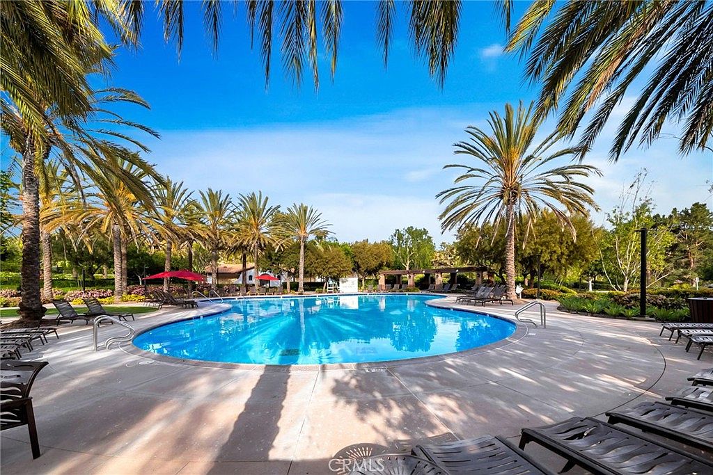 This inviting outdoor pool area is framed by a semicircle of tall palm trees, adding a lush, tropical ambiance. The round, bright blue pool sits at the center of an expansive concrete deck, which is dotted with multiple dark lounge chairs arranged to maximize sun exposure. Red umbrellas punctuate the scene, offering shaded spots for relaxation. The clear blue sky and verdant greenery beyond the pool create a serene backdrop, enhancing the resort-like feel. This space blends natural elements and sleek design, perfect for unwinding or entertaining in a warm, sunny climate.