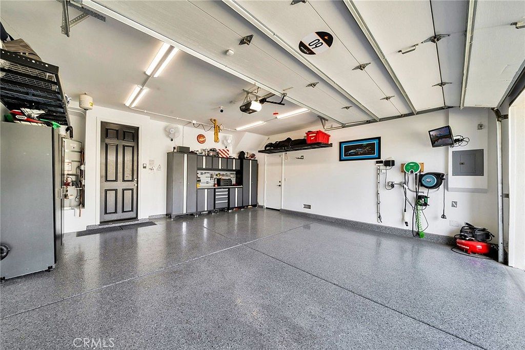 This spacious garage features a clean, polished epoxy floor with a speckled gray finish that enhances durability and ease of cleaning. The walls are painted white, emphasizing brightness and providing a fresh backdrop to the organized storage solutions. A set of tall, sleek gray cabinets and a workbench line one wall, offering ample storage and workspace. Overhead fluorescent lights ensure uniform illumination, making this area practical for both parking and projects. Mounted neatly on the walls are various electrical outlets, a coiled garden hose, and a mounted television, further enhancing functionality and modern convenience.