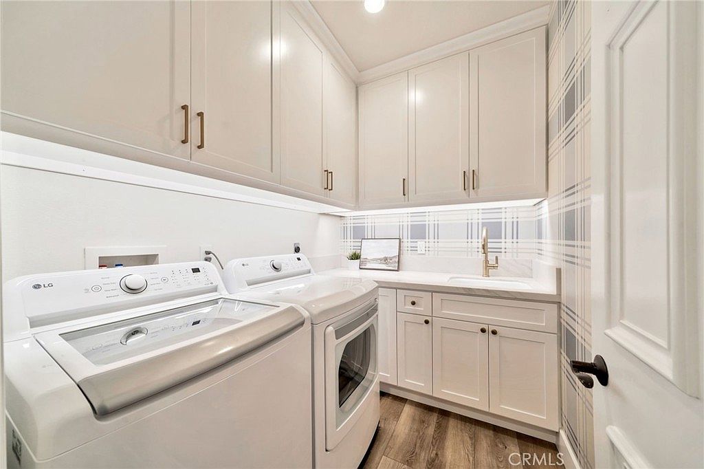 This laundry room offers a bright, clean, and highly functional space featuring a side-by-side washer and dryer set with sleek white finishes. The room is lined with soft white cabinetry, providing ample storage both above and below the countertop, accented by bronze hardware that adds subtle warmth. The countertop is practical and extends into a built-in sink area with a brass faucet, perfect for hand-washing or pre-treating laundry. The walls display a light plaid pattern that introduces a charming texture and village feel while the wood-look flooring balances the design with natural warmth and coziness.