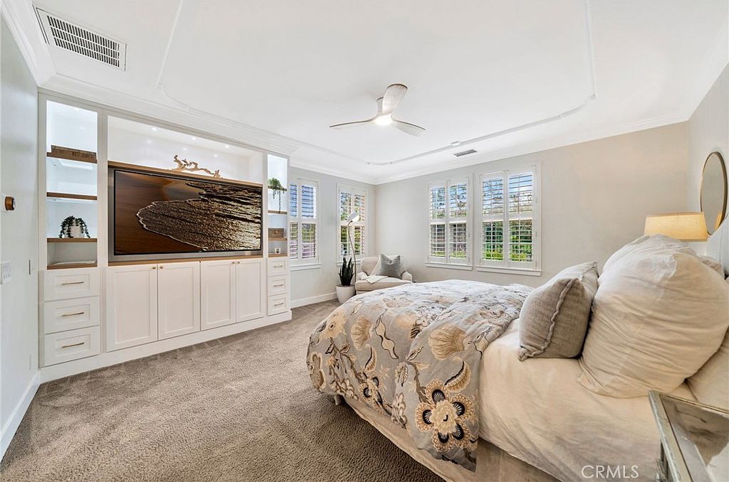 This master bedroom combines comfort with functional elegance, featuring a large built-in entertainment wall with bright white cabinetry and open shelving accents. The television is centrally mounted, framed by recessed lighting and modern decorative elements on the shelves. Plush neutral carpeting enhances the cozy atmosphere, complemented by a soft, floral-patterned comforter in gentle beige and gray tones. Natural light floods the room through multiple shuttered windows, creating a serene and airy ambiance. The ceiling design includes subtle molding and an integrated fan, with a cushioned reading nook by the windows providing a relaxing retreat within the space.