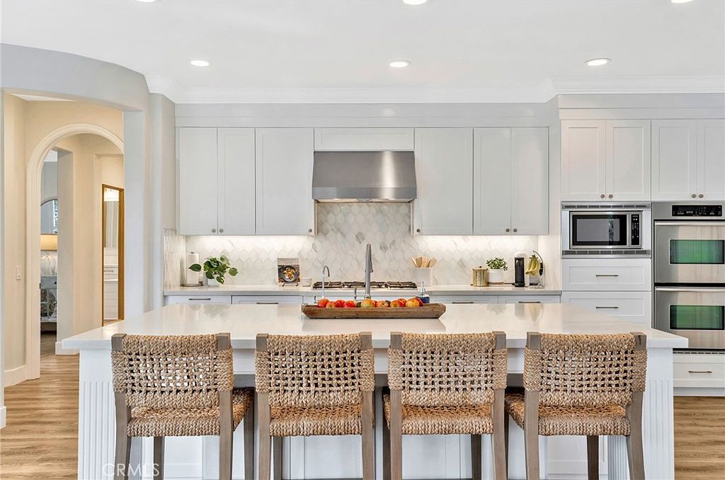 This kitchen features a clean and inviting design centered around a large white island with a smooth countertop perfect for meal preparation and casual dining. Four woven natural-fiber bar stools add warmth and texture against the otherwise sleek, white cabinetry. The backsplash boasts a subtle, patterned tile in soft gray tones, complementing the stainless steel range hood and built-in double ovens. Soft recessed and under-cabinet lighting highlight the minimalist decor, accented by small plants and kitchen essentials, creating an elegant yet functional atmosphere. The light wood flooring adds a natural element that ties the space together harmoniously.
