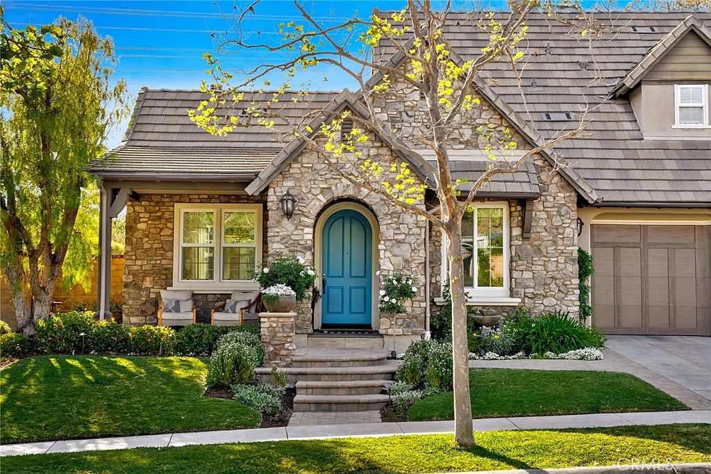 This charming front entrance highlights a cozy stone façade with an inviting archway doorway painted in a vibrant teal blue, creating a delightful focal point. The stonework extends to the small front porch with two cushioned chairs set for relaxation, reflecting a welcoming atmosphere. Symmetrical landscaping with trimmed bushes and potted plants flank the steps leading to the door, enhancing curb appeal. The roof is covered with dark shingles, complementing the natural stone exterior. To the right, a neutral-toned garage door balances the design, while the green lawn and mature trees provide a fresh, tranquil setting.