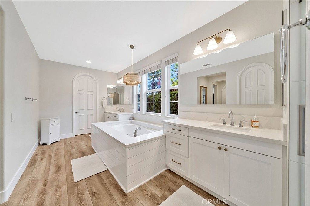This elegant bathroom features a spacious layout with a large built-in soaking tub centrally placed beneath a set of three wide windows, allowing natural light to flood the space. Adjacent to the tub, a white double vanity with sleek cabinetry provides ample storage, topped with a smooth, light-colored countertop and modern chrome faucets. Above the vanity, a broad mirror enhances the room’s brightness. The flooring is a warm wood-look laminate, adding organic texture against the otherwise crisp white walls and cabinetry. Soft lighting fixtures and a woven pendant light bring warmth and subtle sophistication to the clean, contemporary design.