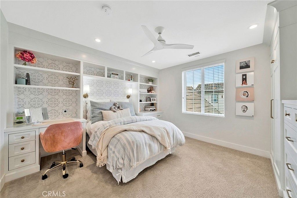 This bedroom features a serene and inviting atmosphere with soft neutral tones dominating the space. The bed is dressed in light striped linens and accented by a cozy throw blanket, positioned centrally against a built-in shelving and cabinetry unit. The built-ins showcase subtle patterned wallpaper in a muted palette, lending visual interest without overwhelming the room. A blush pink velvet office chair adds warmth and texture at a compact desk integrated into the shelving. Natural light streams through a large window with white blinds, brightening the carpeted floor and complementing the white and beige color scheme. Modern recessed lighting and a sleek white ceiling fan complete the clean, contemporary look.