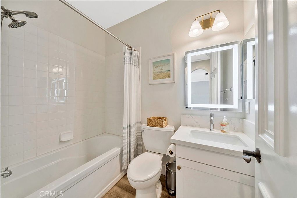 This bathroom features a clean, bright layout with a white color scheme that enhances the sense of space. A classic white bathtub with matching tiled walls is paired with a simple shower curtain in neutral tones. The vanity includes a sleek white cabinet topped with a white quartz countertop and a built-in rectangular sink. Above the sink, a modern, well-lit mirror is complemented by a two-light fixture with frosted glass shades. The toilet is tucked between the tub and vanity, accented by a small woven basket and a metallic trash bin. Light wood-look flooring adds warmth to the otherwise minimalist design.