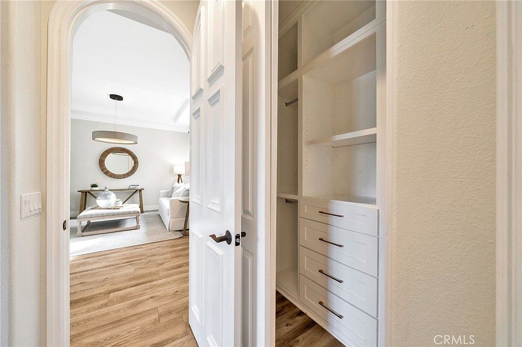 This space highlights a hallway closet with built-in white shelving and drawers, featuring sleek bronze handles, blending functionality with subtle elegance. The soft, neutral beige wall color complements the light wood-look flooring that flows seamlessly into the adjacent living room. The living room offers a calming palette of soft grays and whites, anchored by a plush sofa and a simple wooden coffee table. A round rustic mirror adds a touch of charm above the table, while modern pendant lighting and a floor lamp enhance the cozy yet contemporary atmosphere, demonstrating seamless integration and efficient use of space.