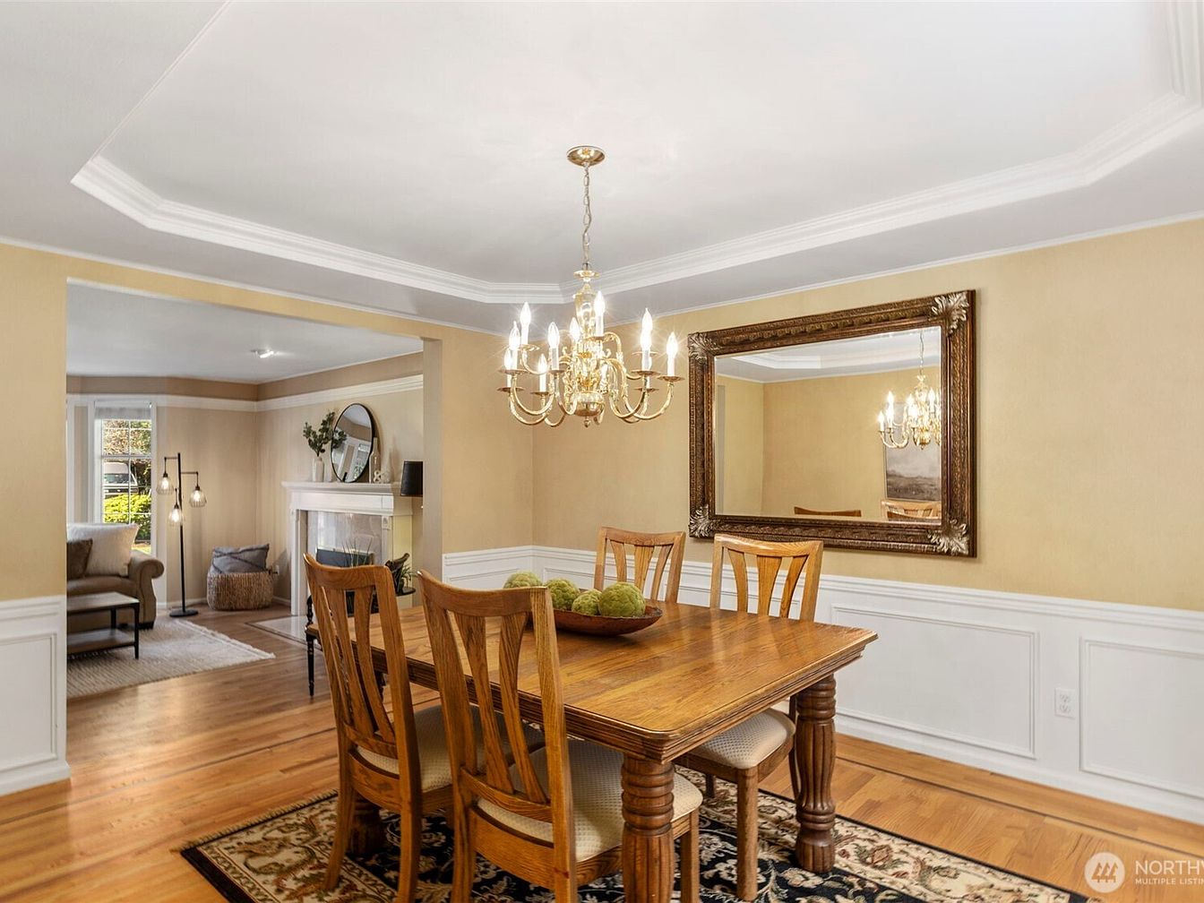 This inviting dining room features a warm beige and white color scheme that complements the natural wood flooring and classic wood dining table with six chairs. The table, adorned with a decorative bowl holding green moss balls, sits on a richly patterned area rug that adds depth and texture. Crown molding and wainscoting enhance the room’s elegant architectural details. A sophisticated gold chandelier hangs centrally above the table, reflecting softly in a large, ornately framed wall mirror, which visually expands the space. The open layout connects the dining area seamlessly to a cozy living room with a fireplace and ample natural light.