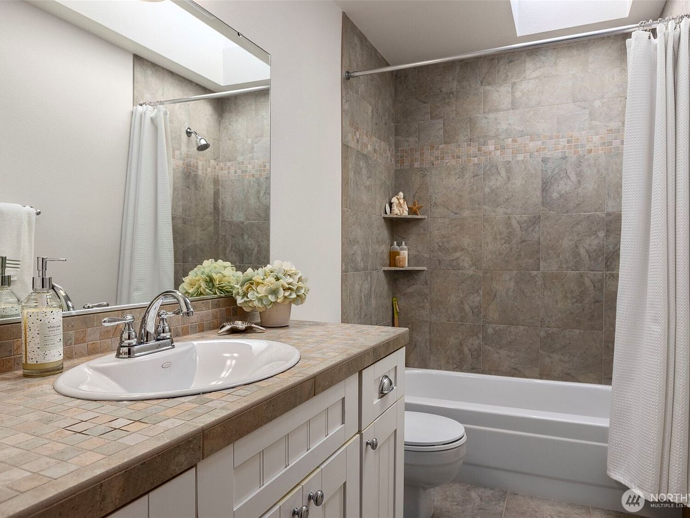 This bathroom features a spacious vanity area with dark wood cabinetry and a granite countertop, adding warmth and texture to the space. The dual sinks are complemented by large mirrors framed in matching wood trim, reflecting ample light from two skylights above. The lighting consists of polished chrome fixtures with frosted glass shades, creating a soft and inviting glow. The walk-in shower, located adjacent to the vanity, is surrounded by taupe tiles with decorative mosaic accents that continue onto the bathtub’s surrounding ledge. Neutral gray floor tiles unify the layout, offering a modern, elegant ambiance filled with natural light and rich finishes.