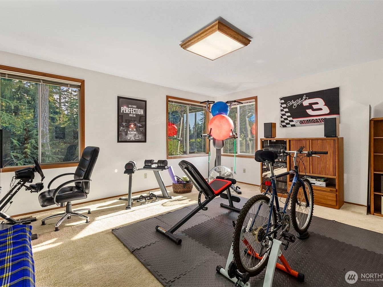 This bright and spacious room serves as a multifunctional home gym and recreational area. Soft beige carpeting contrasts with the black interlocking exercise mats covering the central workout zone where a stationary bike and adjustable bench are positioned. Large windows on two sides flood the space with natural light, highlighting the neutral white walls and wooden window frames. Fitness equipment, including dumbbells, resistance bands, and stability balls, adds to the active lifestyle vibe. The wooden cabinetry and a retro-styled flag hung on the wall add warmth and personality. A black leather office chair offers a spot for rest or focus, reinforcing a clean, practical aesthetic.