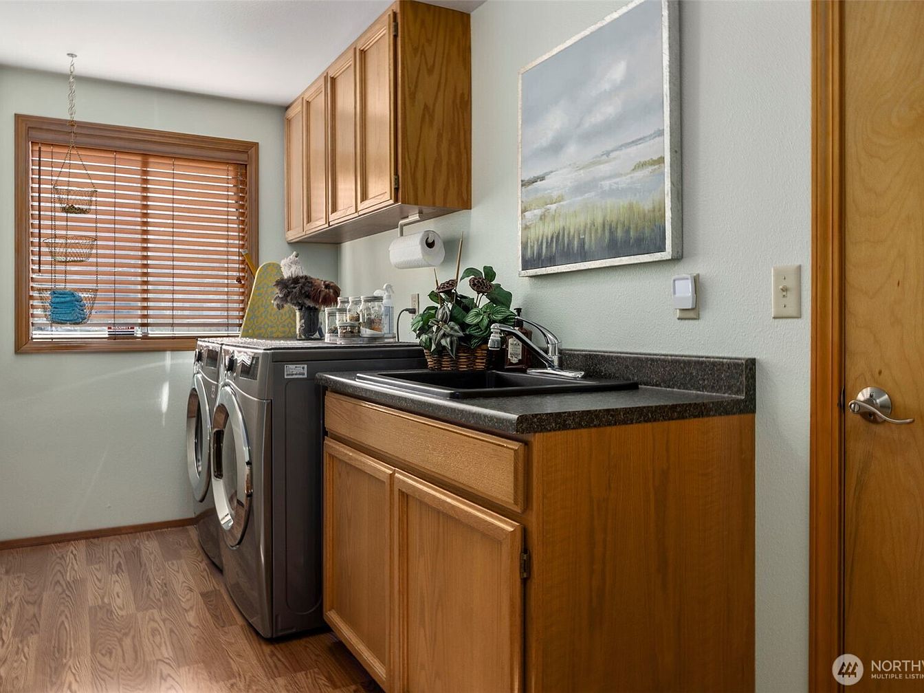 This laundry room offers a practical layout with a front-loading washer and dryer positioned side by side beneath a large window with wooden blinds, allowing natural light to softly illuminate the space. Warm wood cabinetry above and below the black countertop provides ample storage, blending functionality with a cozy, traditional feel. The countertop features a built-in black sink, accompanied by a small green plant adding a touch of nature. Soft blue-green walls complement the natural wood tones and earth-colored flooring, while a serene landscape painting adds a calming element, creating a welcoming and organized utility space.